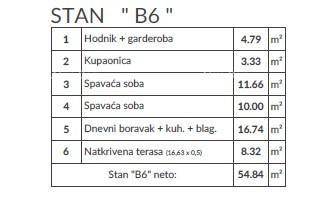Stan B6, površine 54.84 m2, nalazi se na 1 katu zgrade i sastoji se od: hodnik+garderoba, dnevni boravak sa kuhinjom i blagovaonicom, 2 spavaće sobe, kupatila i natkrivene terase.
