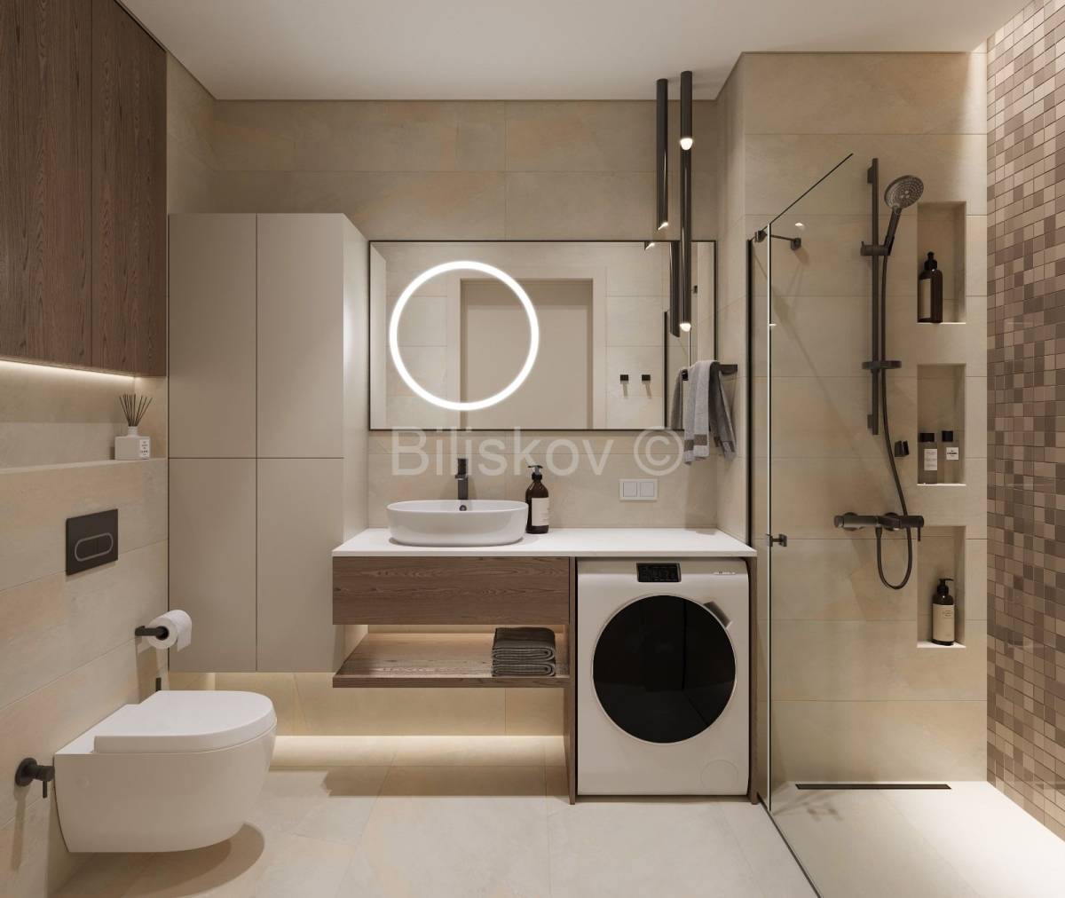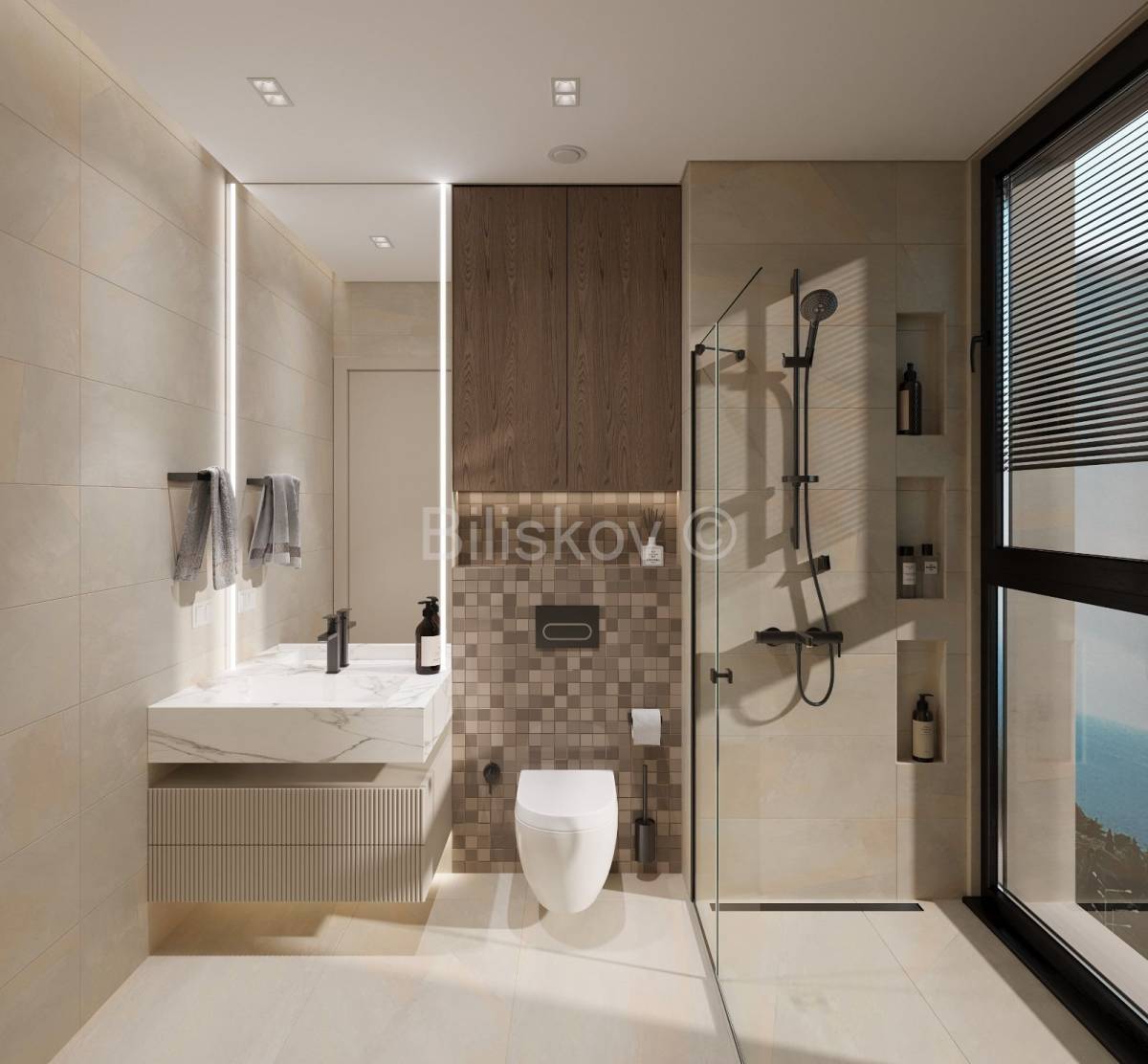 Stan uključuje kuhinju, blagovaonicu i dnevni boravak od 35,21 m², dvije udobne spavaće sobe (13,13 m² i 12,59 m²), modernu kupaonicu (4,27 m²), odvojeni WC (1,69 m²), praonicu/vešeraj (1,94 m²) te funkcionalan hodnik (6,31 m²) koji povezuje sve prostorije. Posebnu vrijednost daje prostrana lođa s koje se pruža očaravajući pogled na Trogirski zaljev – savršeno mjesto za jutarnju kavu ili večernje opuštanje uz zalazak sunca. Zgrada ima lift, a stanu pripada zajednički vrt.