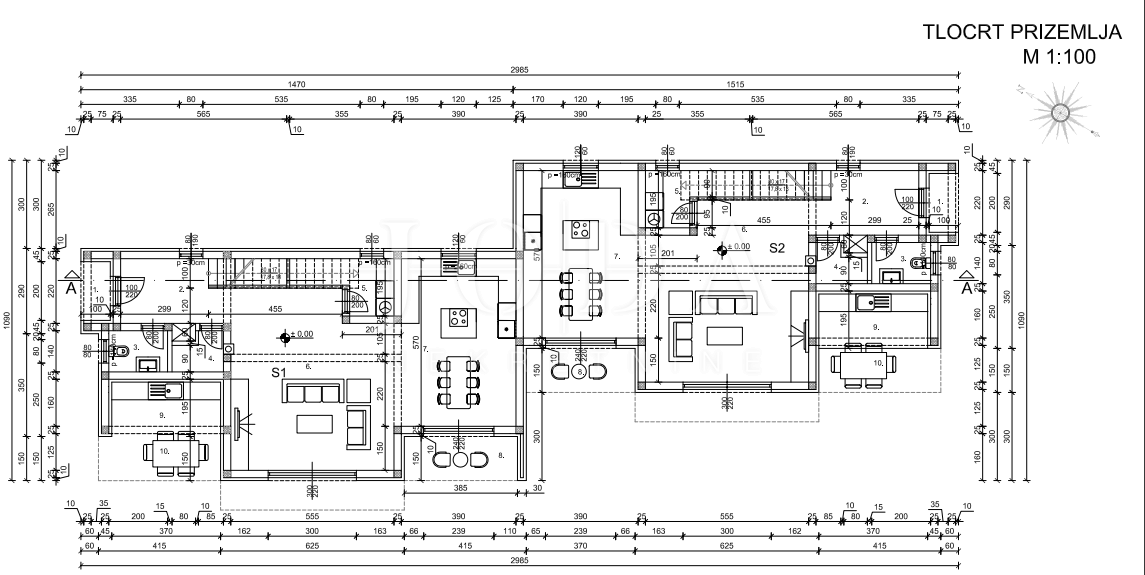 Prizemlje će se sastojati od natkivenoga ulaza, hodnika, wc-a, stepeništa za kat, spremišta, vešeraja, te open space dijela kojega će činiti dnevni boravak, kuhinja i blagovaona. Čitav dnevni dio će imati izlaz na prostranu terasu na kojoj će se nalaziti ljetna kuhinja, lounge zona, veliko sunčalište te infiniti bazen.