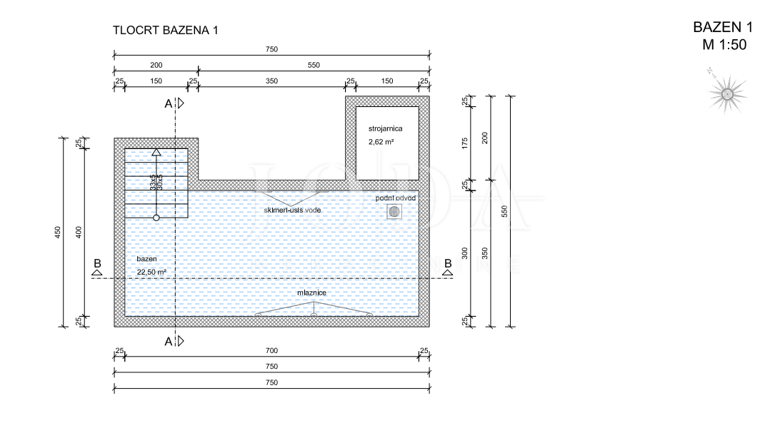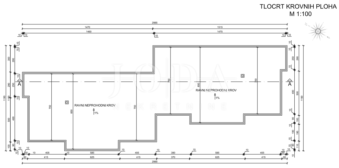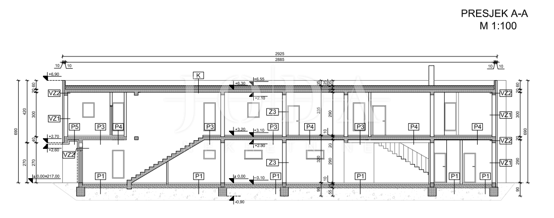 Činiti će je prizemlje i prvi kat, orijentacija će biti sjever-jug, a sa južne strane u suterenu će imati garažu veličine 46m2 koja je dostatna za parking 2 automobila.