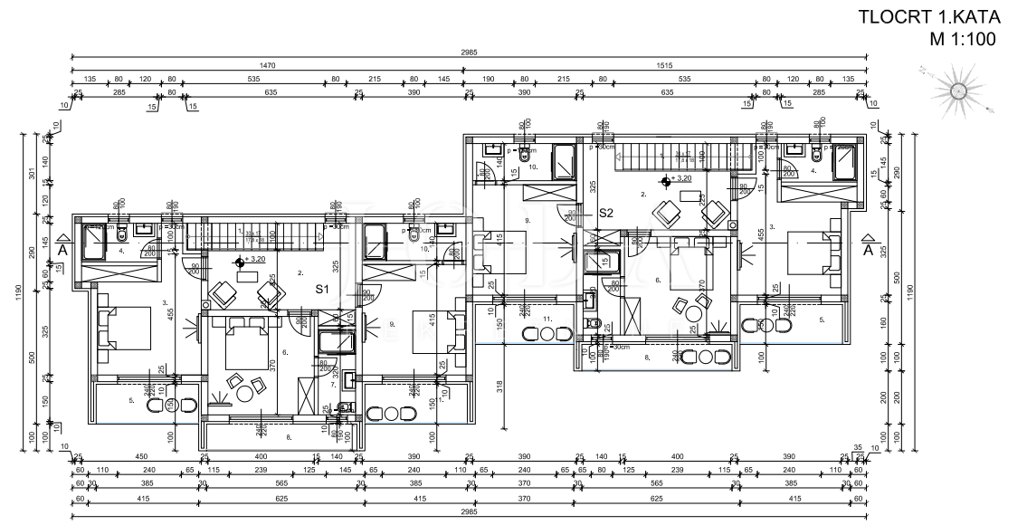 Na katu će se nalaziti predsoblje te tri spavaće sobe, svaka sa vlastitom kupaonom i izlazom na vlastitu loggiu.