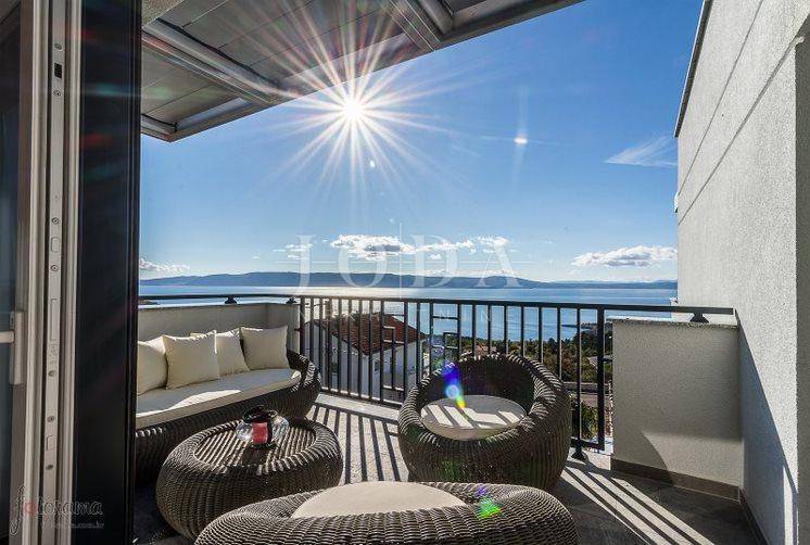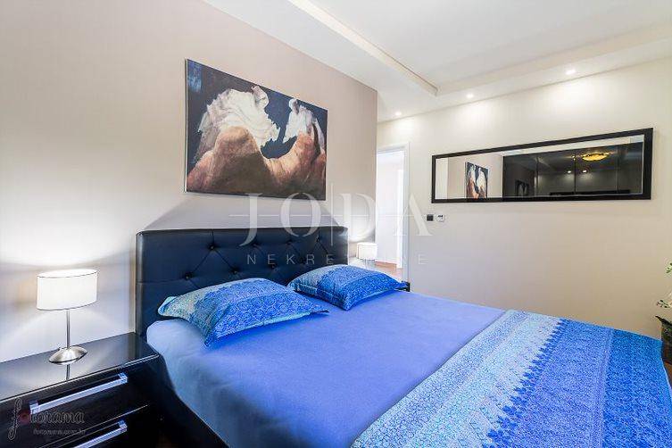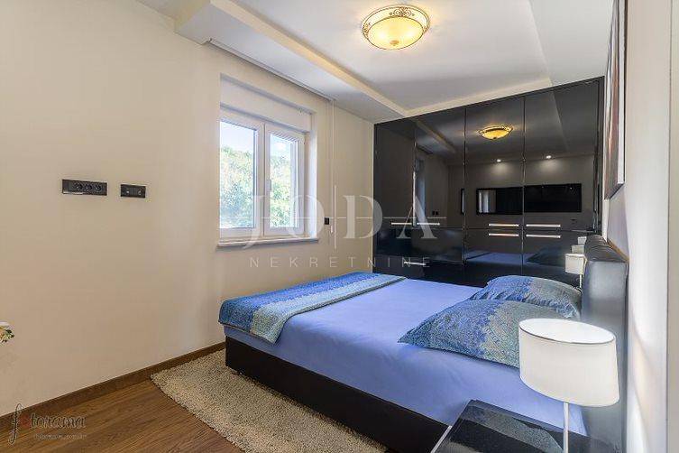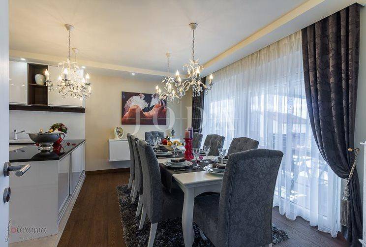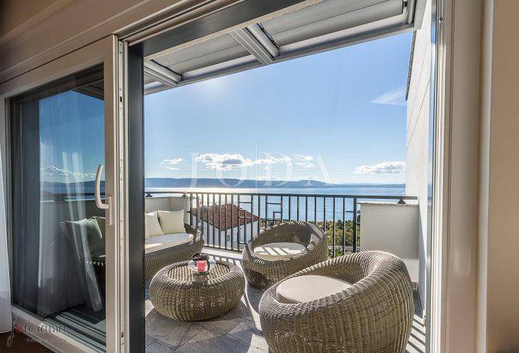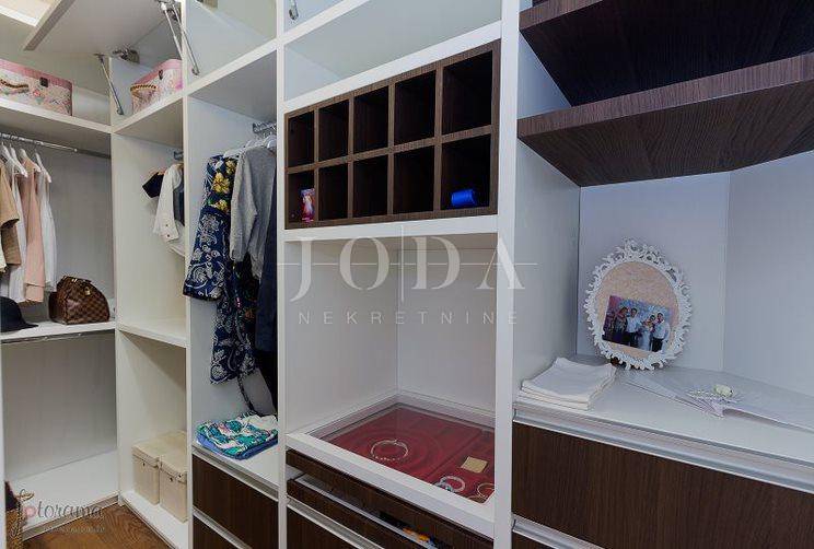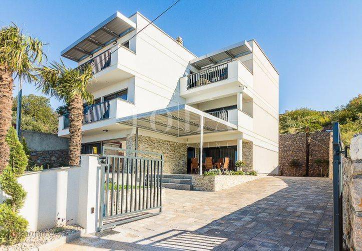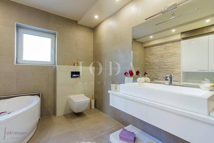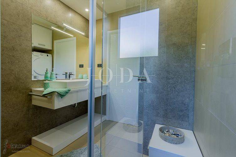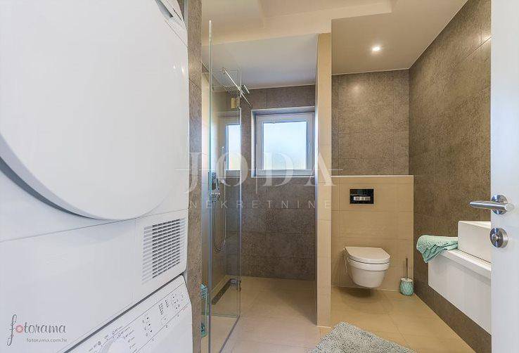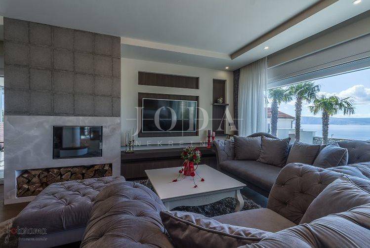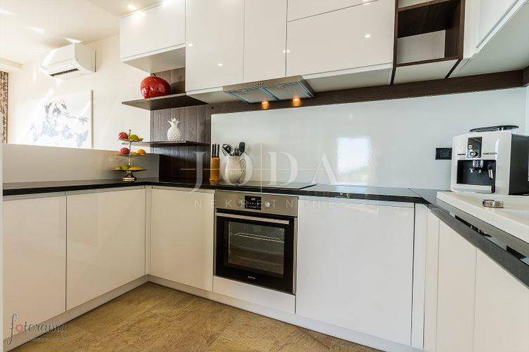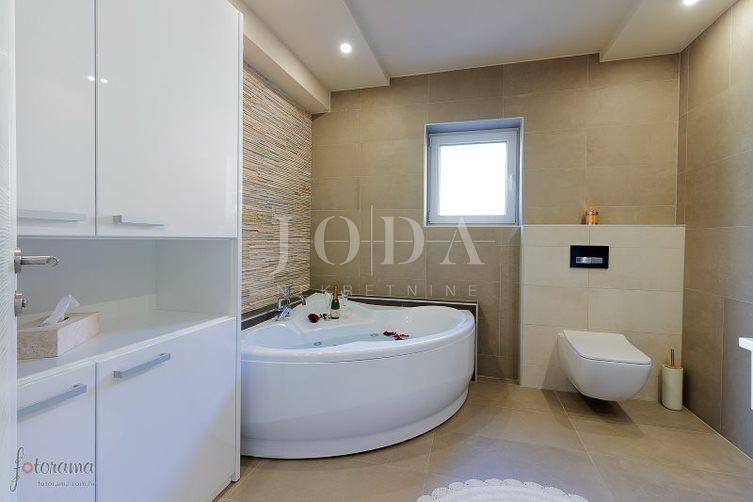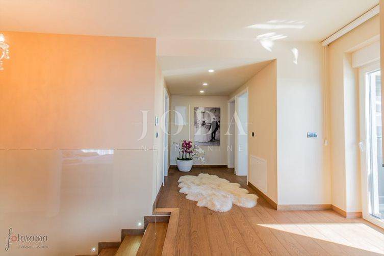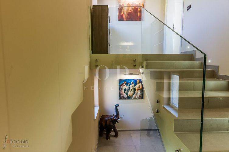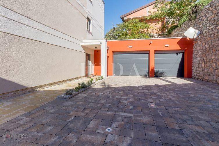 na vrhu je dvosobni stan sa dnevnim boravkom i velikim balkonima sa kojih se pruža spektakularan pogled.Dupla garaža iza kuće sa spremištem i vanjskim parkingom za više automobila.