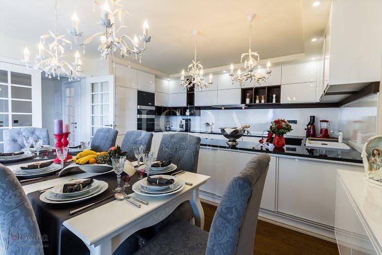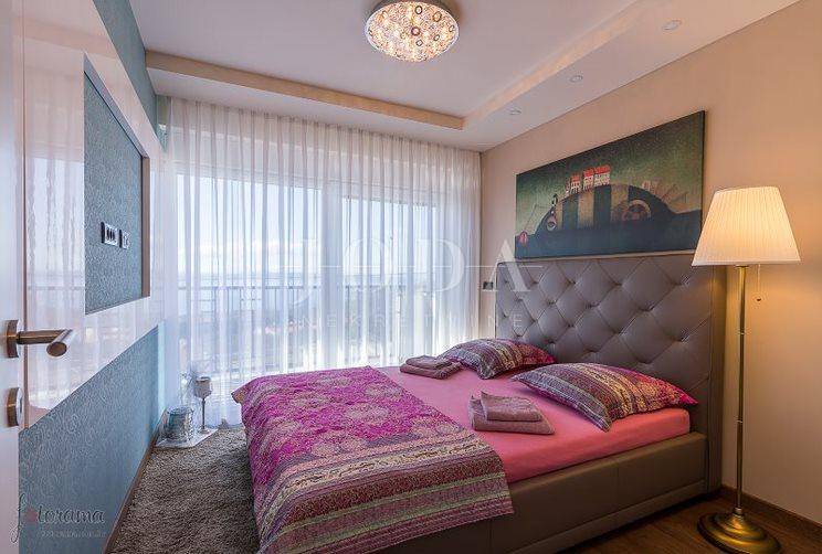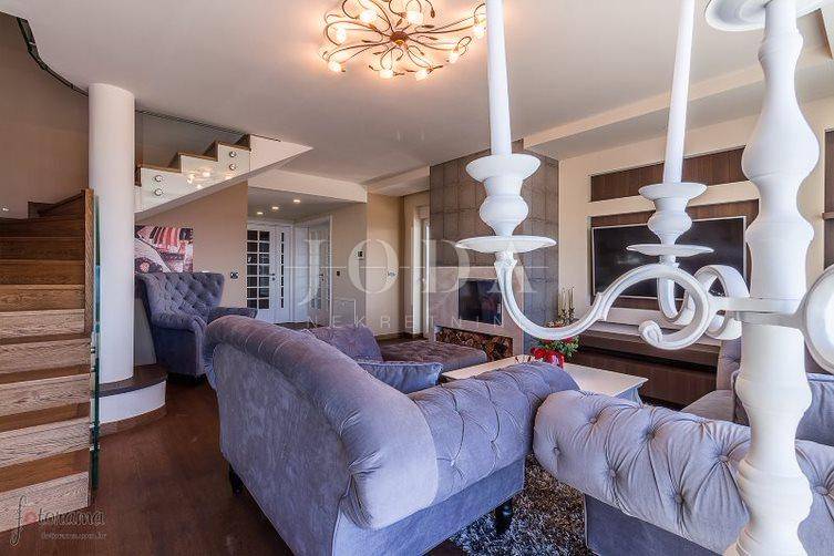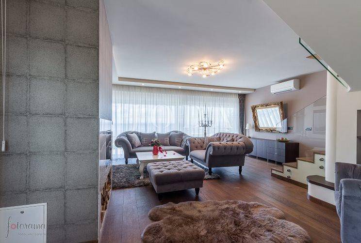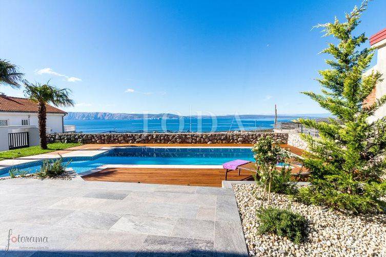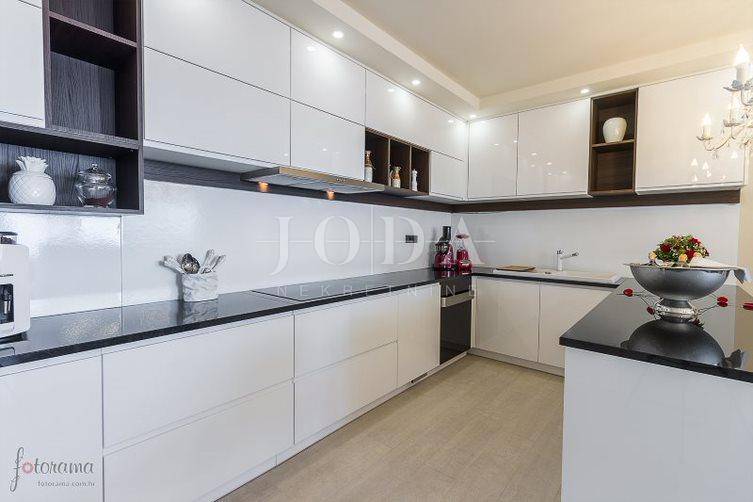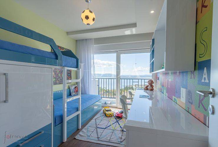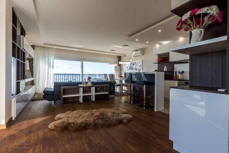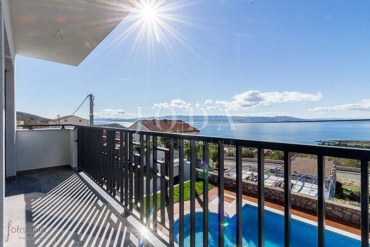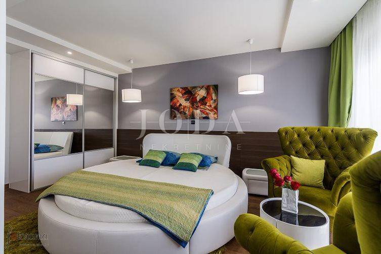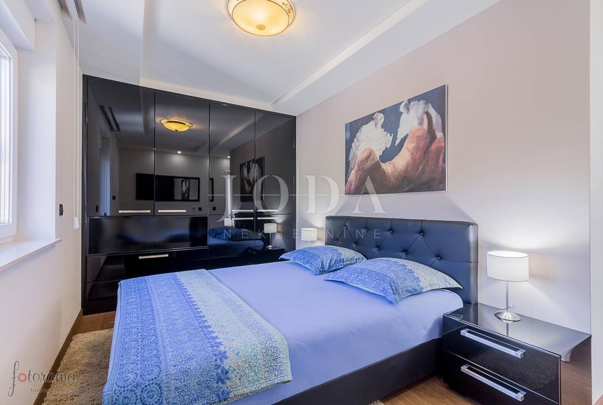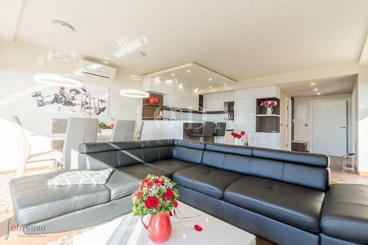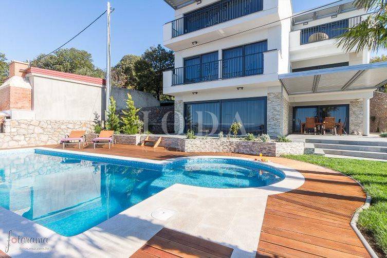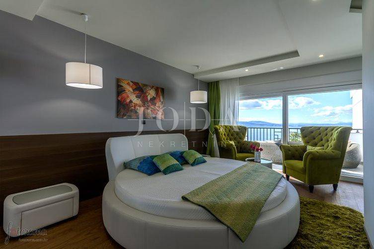 na vrhu je dvosobni stan sa dnevnim boravkom i velikim balkonima sa kojih se pruža spektakularan pogled.Dupla garaža iza kuće sa spremištem i vanjskim parkingom za više automobila.