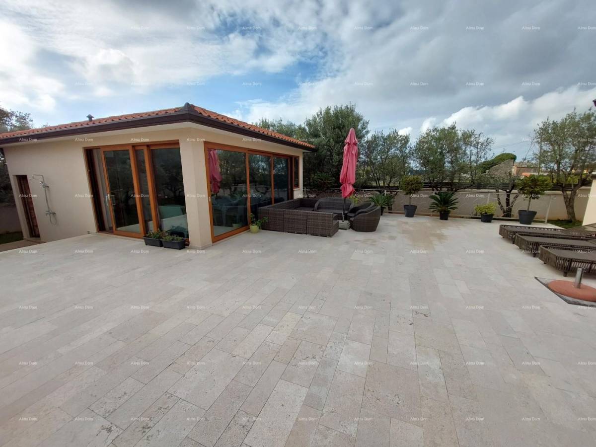 Prodaje se prekrasna kuća u Vodnjanu sa dva stana i unutarnjim bazenom. Zemljište na kojem je kuća napravljena veličine je 1683m2. Kuća se sastoji od podruma, prizemlja i prvog kata. Kuća je velika 489m2. Na prvom katu nalaze se dva stana te svaki stan ima svoj zaseban ulaz. Prvi stan je dvoetažni te se na prvoj etaži nalazi blagavaonica, kuhinja sa dnevnim boravkom i blagavaonicom, gardaroba te toalet za goste. Drugoj etaži se pristupa preko unutarnjeg stepeništa koje vodi na drugi kat kuće gdje se nalaze tri spavaće sobe sa vlastitim kupatilom. Također sa drugog kata se izlazi na prostranu terasu koja je dijelom natkrivena i nenatkrivena drugim dijelom. Stan koji se nalazi u prizemlju je jednoetažni te je veličine 43m2. Jednoetažni stan se sastoji od dnevnog boravka sa kuhinjom, blagovaonicom, spavaćom sobom i jednim kupatilom. Unutarnji bazen je veličine 18m2 odnosno dimenzija 6x3. također u kući se nalaze dvije velike zatvorene terase i moderna ljetna kuhinja. Kuća se nalazi na sređenoj, zatvorenoj okućnici. U svakoj sobi se nalaze klima uređaji te je kuća skroz klimatizirana. Kuća se prodaje potpuno namještena. Kuća se nalazi nekoliko stotina metara od glavnog gradskog traga, trgovina i svih bitnih sadržaja ali je opet u dijelu Vodnjana koji je miran te nema previše prometa. Kuća se nalazi 6 minuta vožnje automobilom do prve plaže te se nalazi 12 minuta do Pule. Kuće se može baviti turizmom i iznajmljivanjem te je pogodna za ugodan i dug boravak.