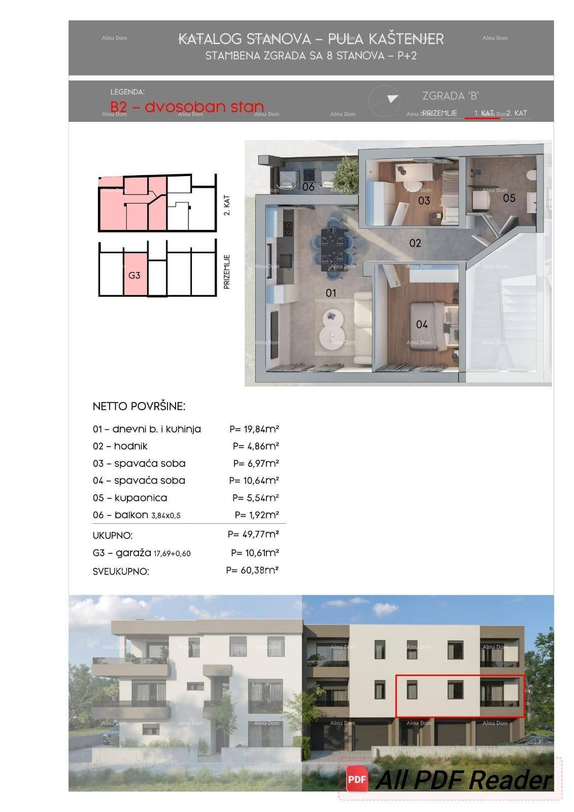 Površina od 60,38 m² obuhvaća dvije spavaće sobe, dnevni boravak s kuhinjom i blagavaonicom te terasom, pružajući optimalan raspored za udoban život.