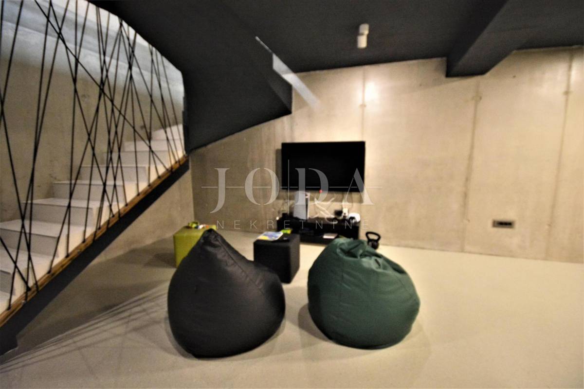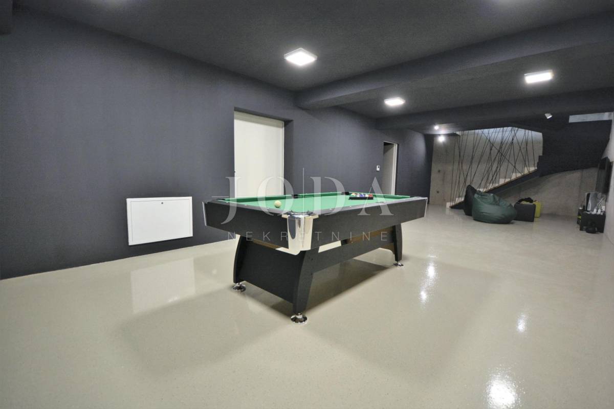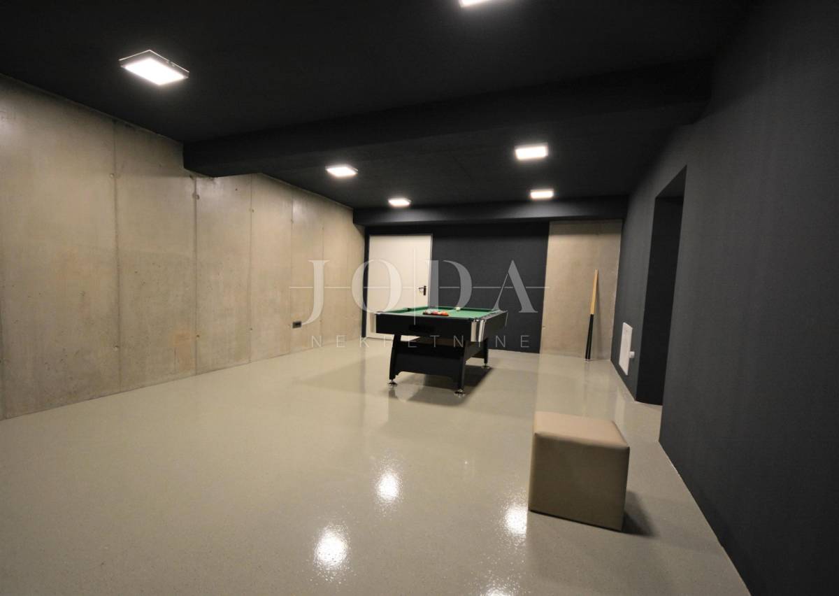 Sastoji od tri etaže - suteren, prizemlje i kat. U suterenu sa nalazi igraonica s TV-om, wellness kutak koji čine sauna, jacuzzi i tuš te kotlovnica za podno grijanje i podno hlađenje, spremište, praonica rublja s perilicom i sušilicom rublja.