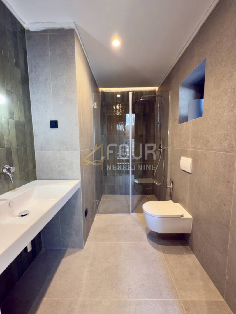 Podne obloge čine visokokvalitetna keramika u funkcionalnim prostorima te chevron parket u dnevnim i spavaćim zonama, što prostoru daje profinjen karakter i osjećaj topline.