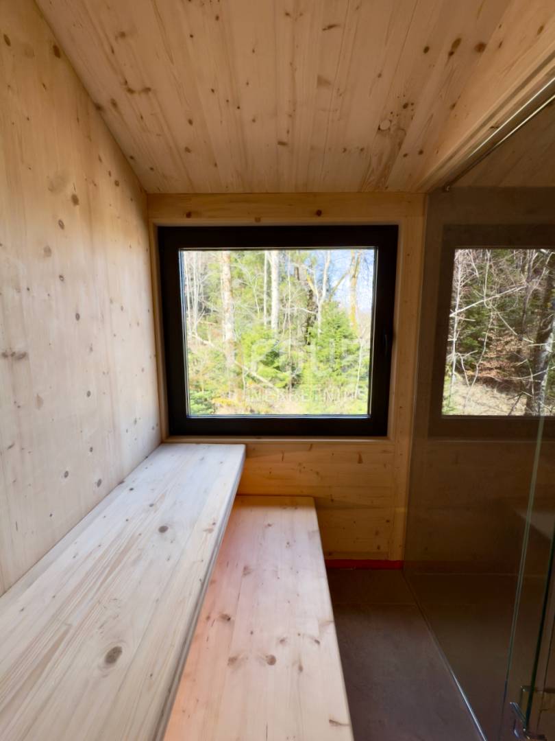 Kroz prozor se otvara pogled na šumu, stvarajući jedinstven doživljaj opuštanja u potpunom skladu s prirodom.