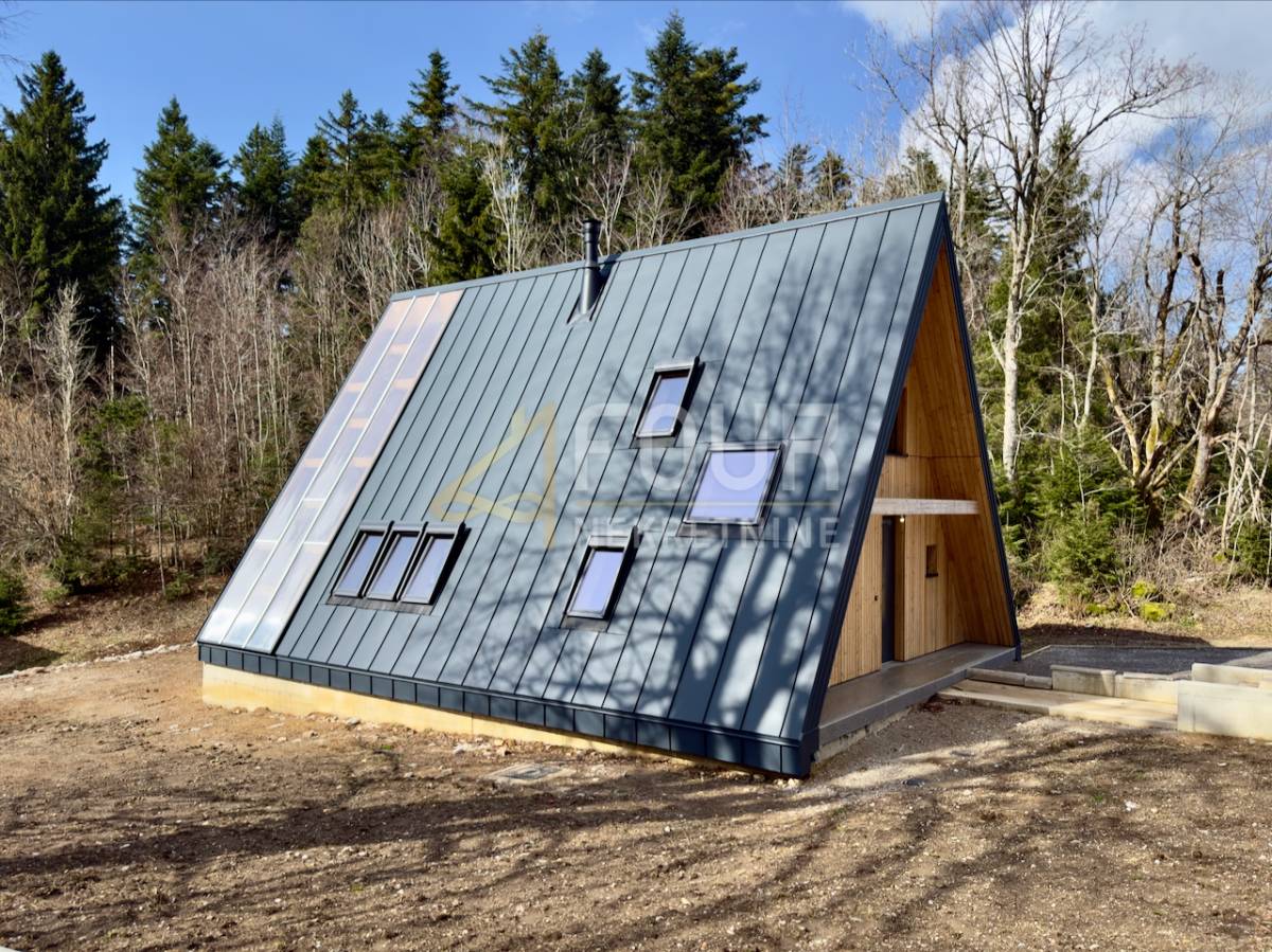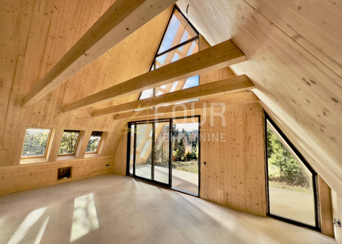 Ova jedinstvena planinska kuća oblikovana je kao prozračni, svjetlom ispunjeni volumen – gotovo osam metara visine i velike staklene stijene brišu granicu između interijera i šume.