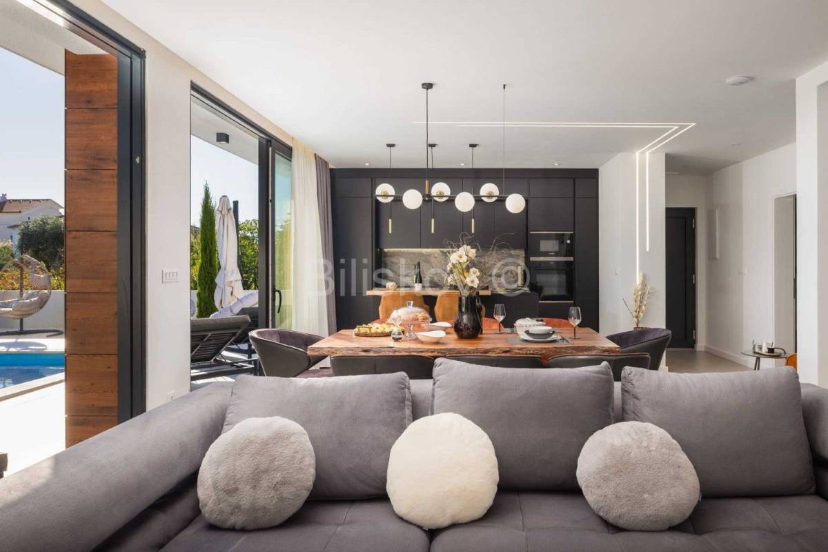 Prva etaža sastoji se od prostranog dnevnog dijela u kojem su opremljena kuhinja, trpezarija i veliki dnevni boravak s direktnim izlazom na terasu i spavaća soba s vlastitim kupatilom.