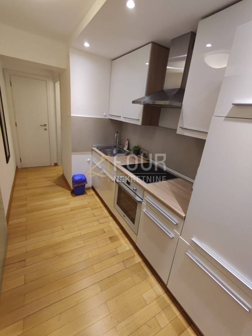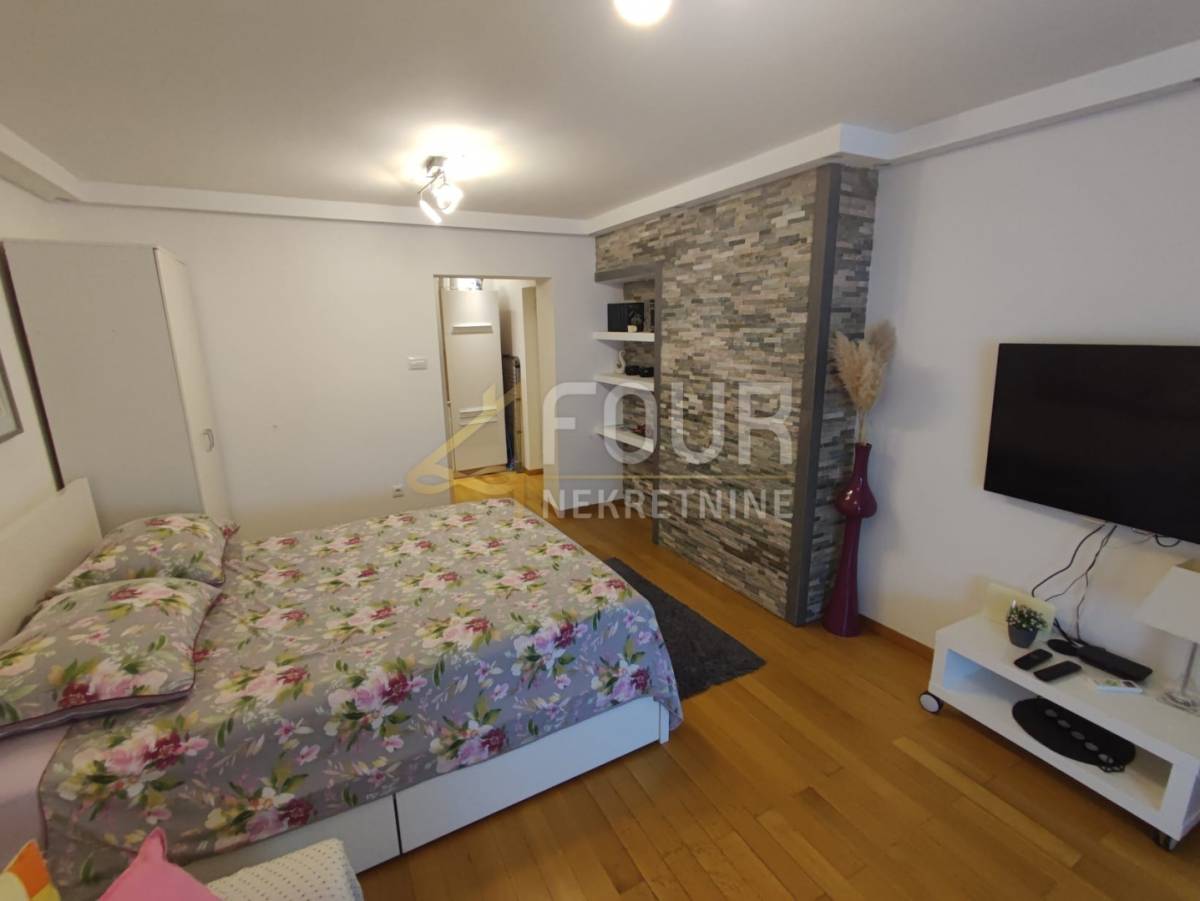 Sastoji se od sobe, hodnika s radnom kuhinjom, izbe, kupaonice s WC-om i balkona. Opremljen je klimom, električnim grijalicama, PVC stolarijom, protuprovalnim vratima i parketom. Parking je besplatan i dostupan ispred zgrade.