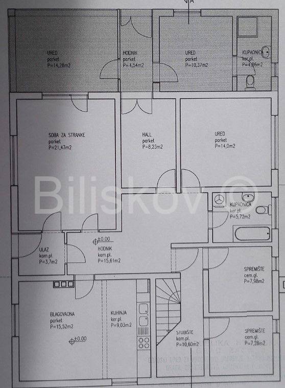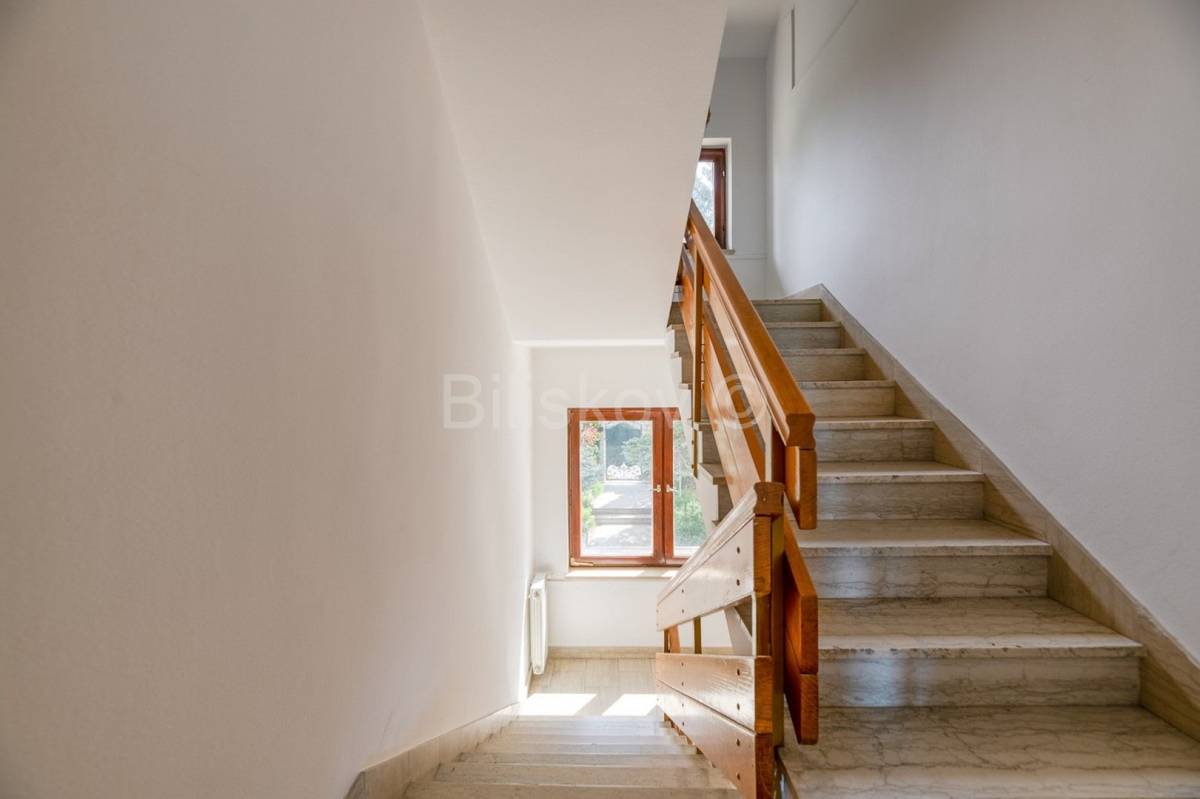 Samostojeća kuća stambene površine 685 m2 koja se sastoji od 4 etaže s pomoćnom zgradom od 115 m2 na 2 etaže, na zemljištu od 1274 m2, izgrađena 1987. godine.