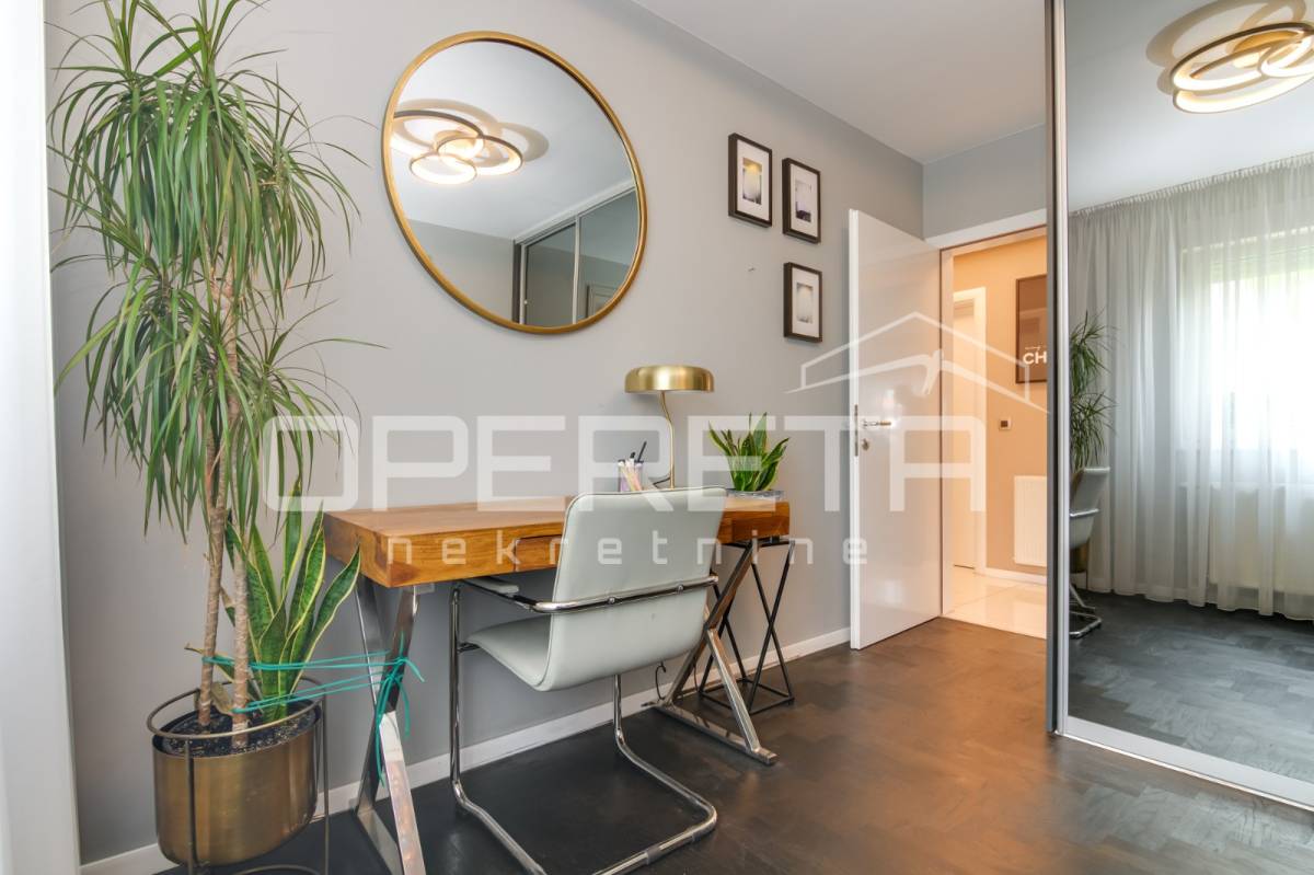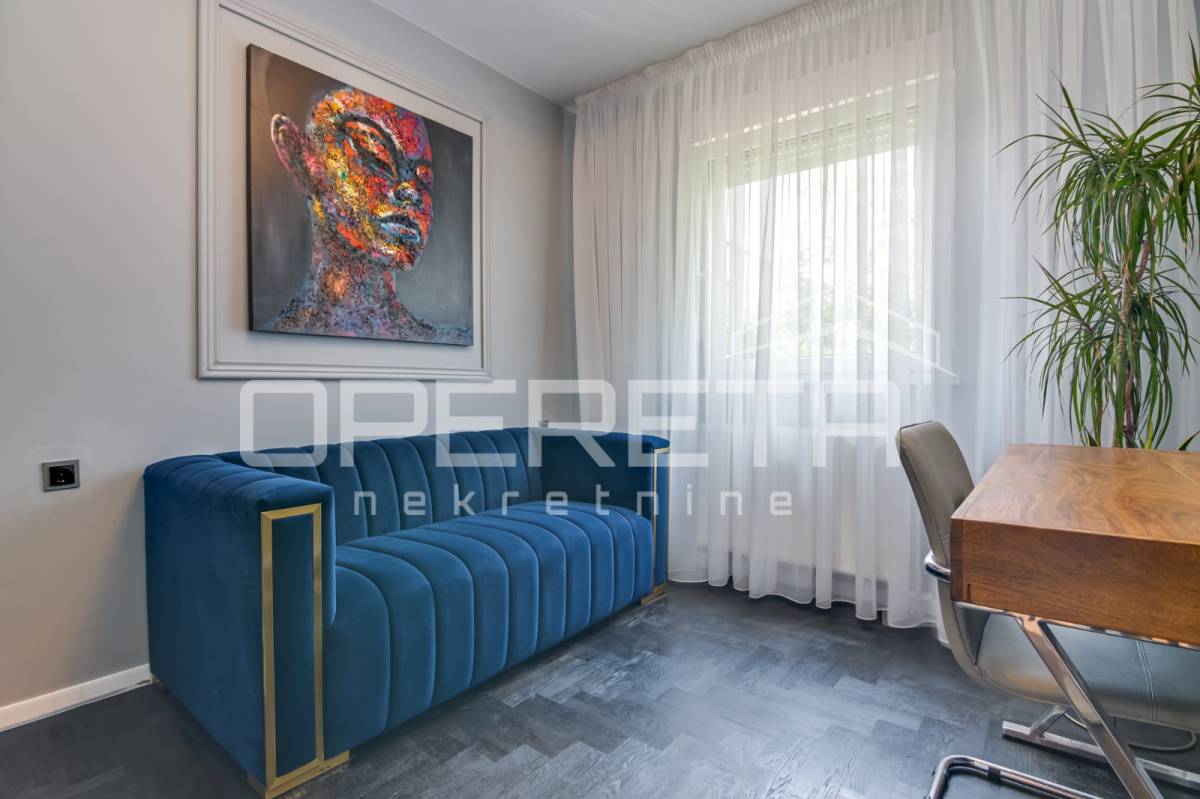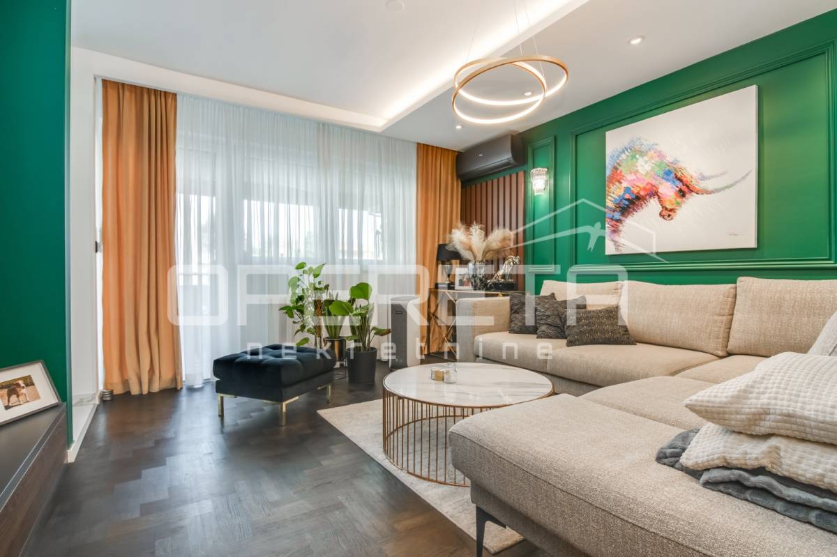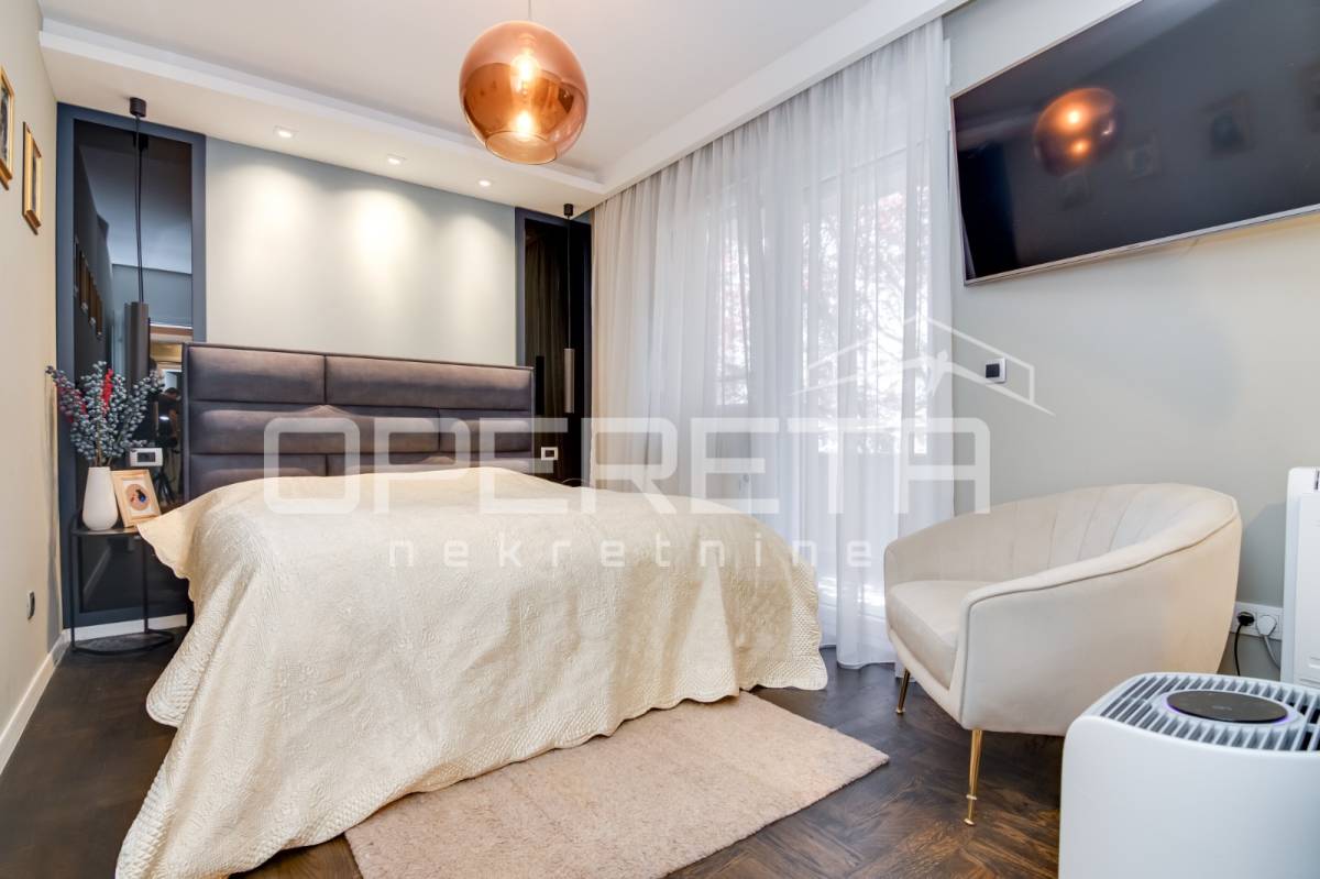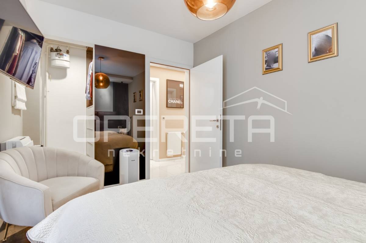 Luksuzan stan na 1.katu manje zgrade, u mirnoj i tihoj ulici. Sastoji se od hodnika, radne sobe, spavaće sobe s walk-in ormarom s izlazom na balkon, kupaonice te dnevnog boravka s kuhinjom i blagovaonicom s izlazom na balkon. Stan je kompletno namješten i opremljen s luksuznim namještajem, opremom i uređajima te prilikom renovacije stana prije par godina korišteni su kvalitetni materijali.