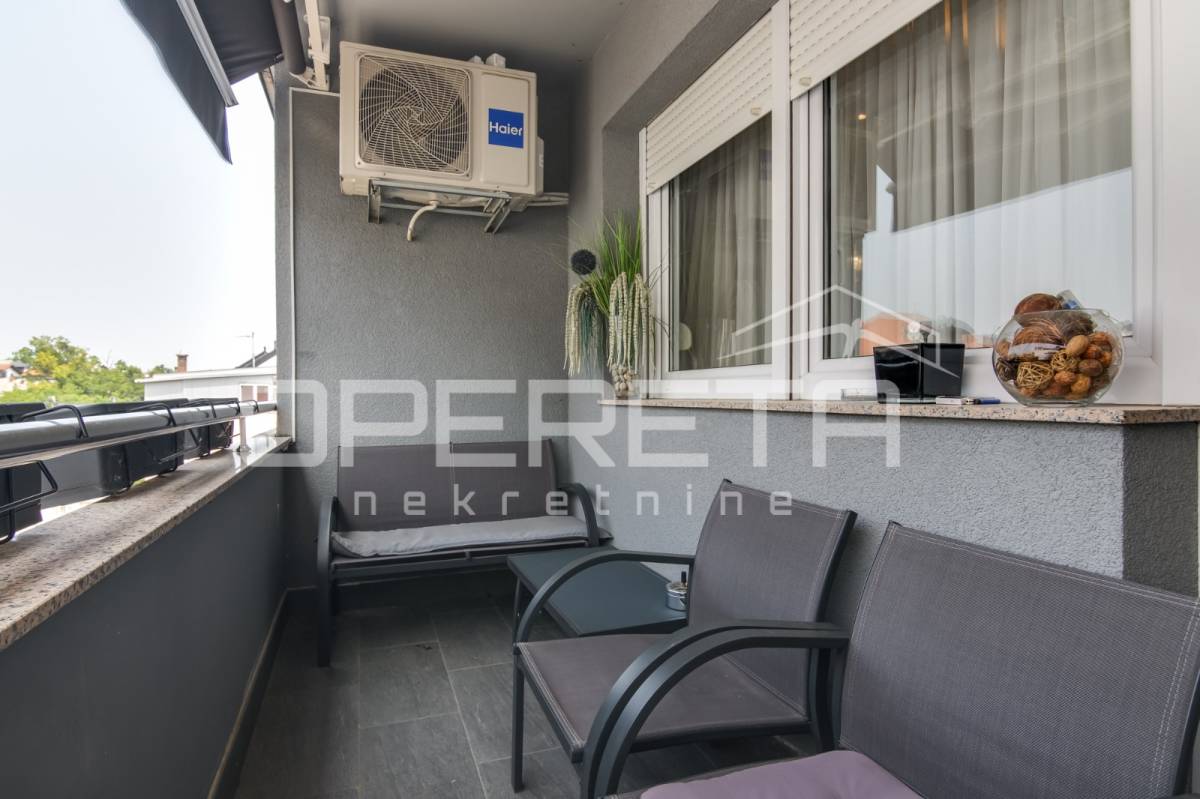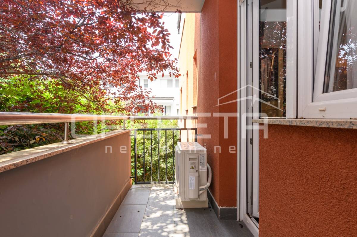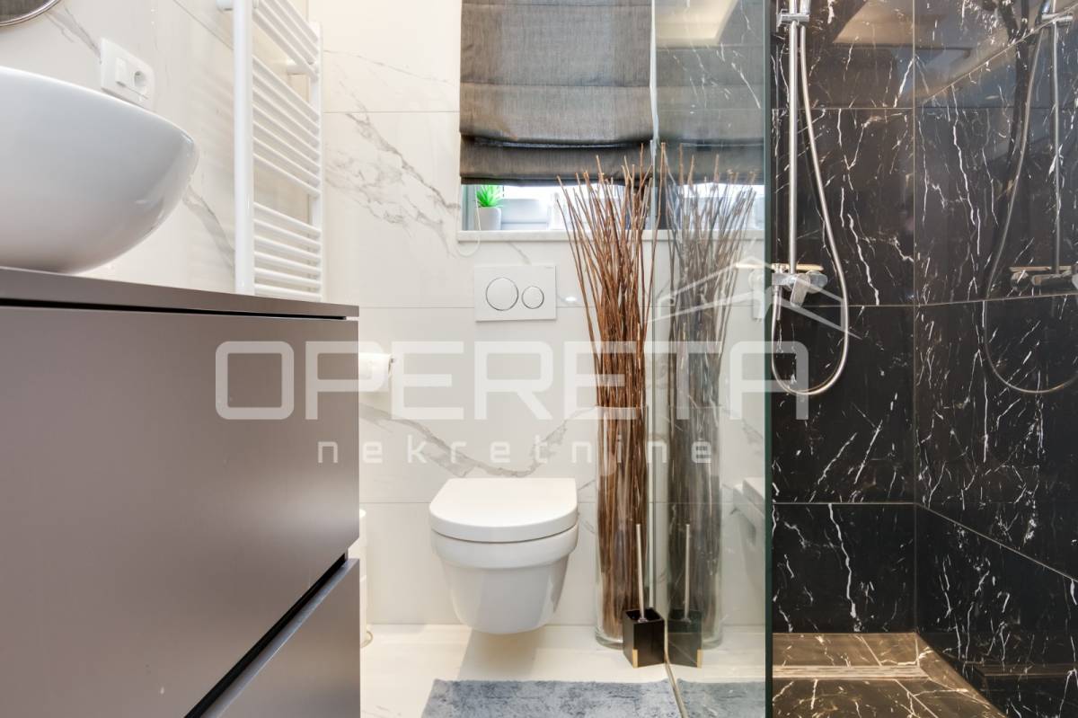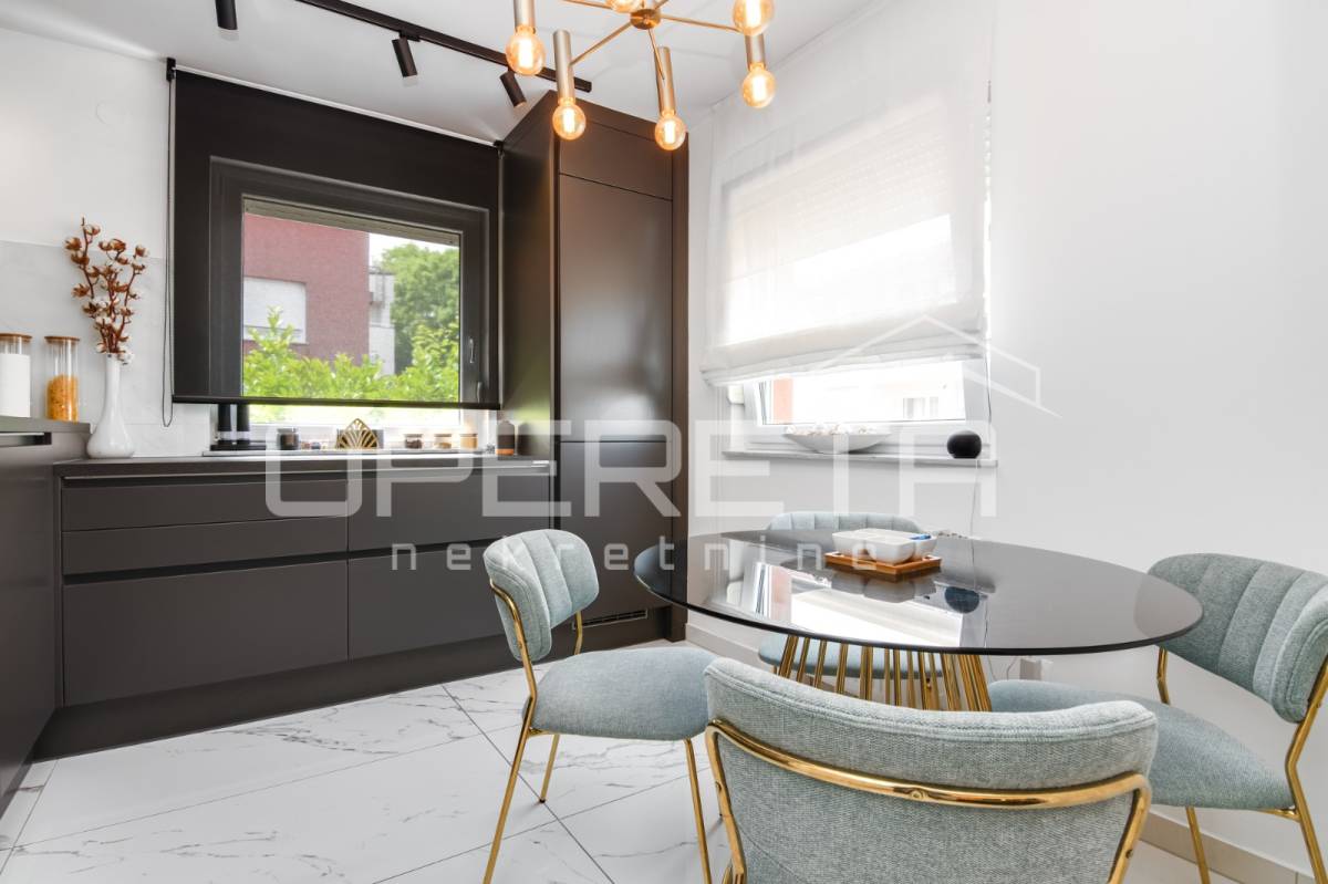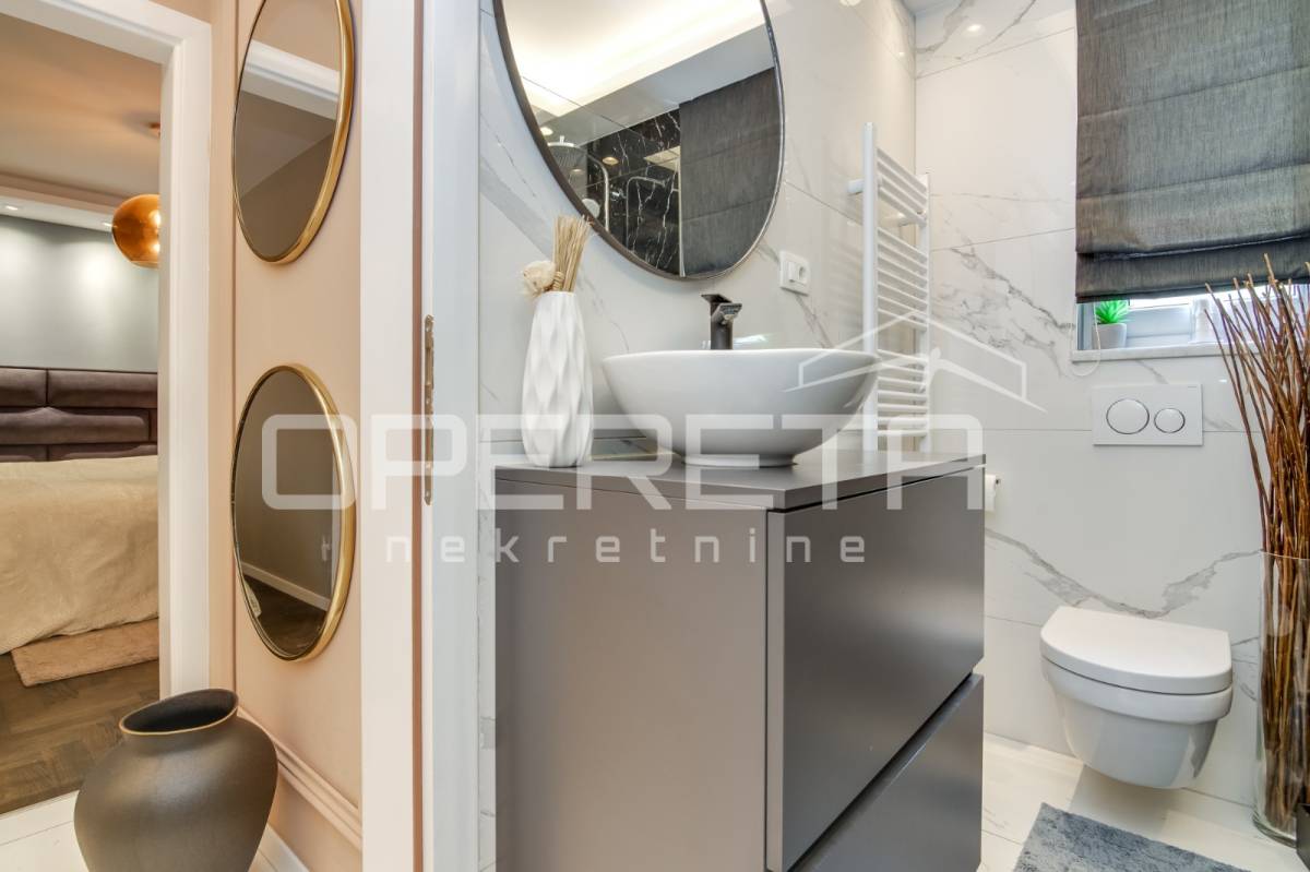 Luksuzan stan na 1.katu manje zgrade, u mirnoj i tihoj ulici. Sastoji se od hodnika, radne sobe, spavaće sobe s walk-in ormarom s izlazom na balkon, kupaonice te dnevnog boravka s kuhinjom i blagovaonicom s izlazom na balkon. Stan je kompletno namješten i opremljen s luksuznim namještajem, opremom i uređajima te prilikom renovacije stana prije par godina korišteni su kvalitetni materijali.
