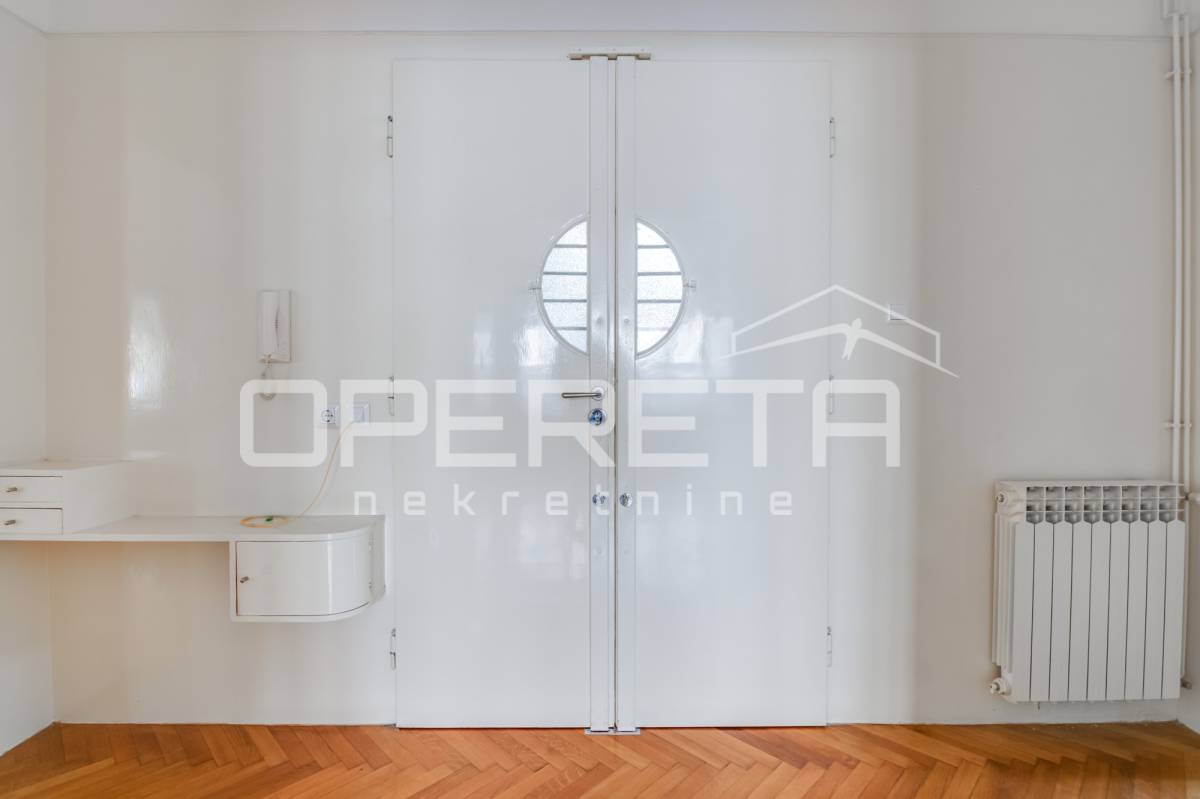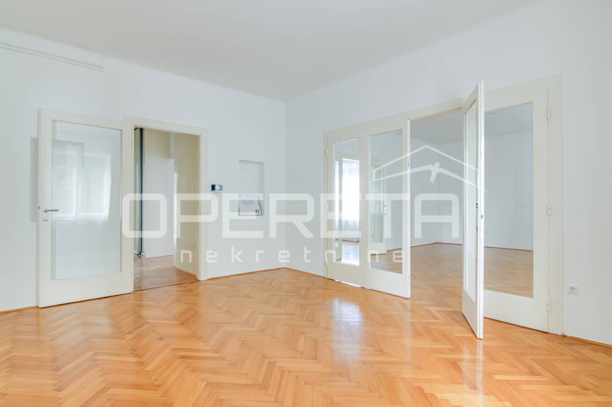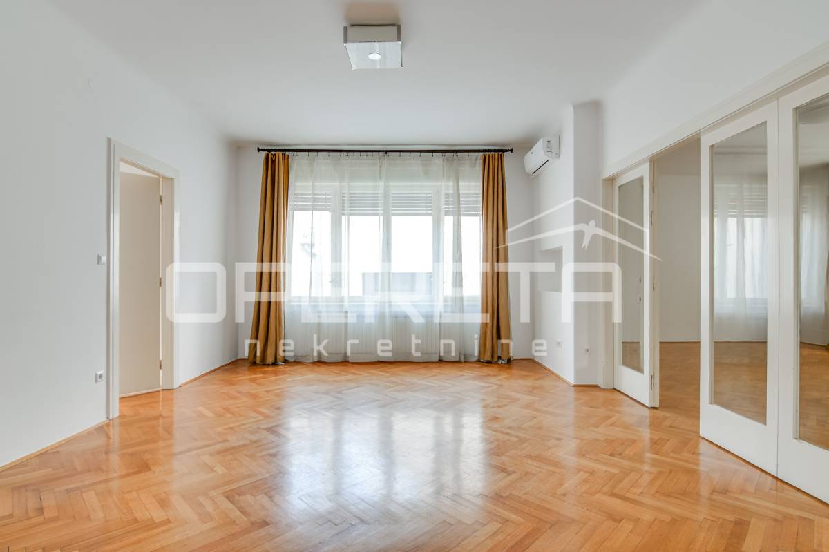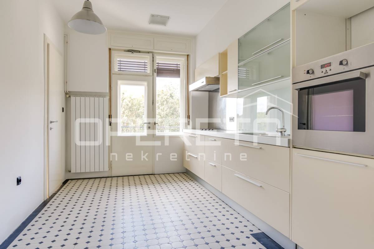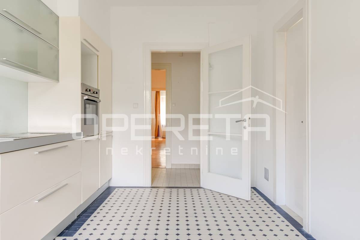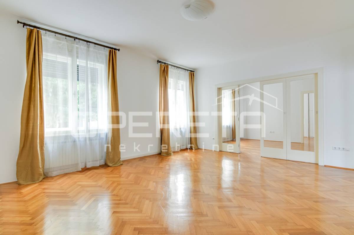 Elegantan, prostran, 5-soban građanski stan površine 160 m2 s odvojenom kuhinjom, spremištem, kotlovnicom, dvije kupaonice i balkonom s kojeg se pruža predivan pogled na Dubravkin put.