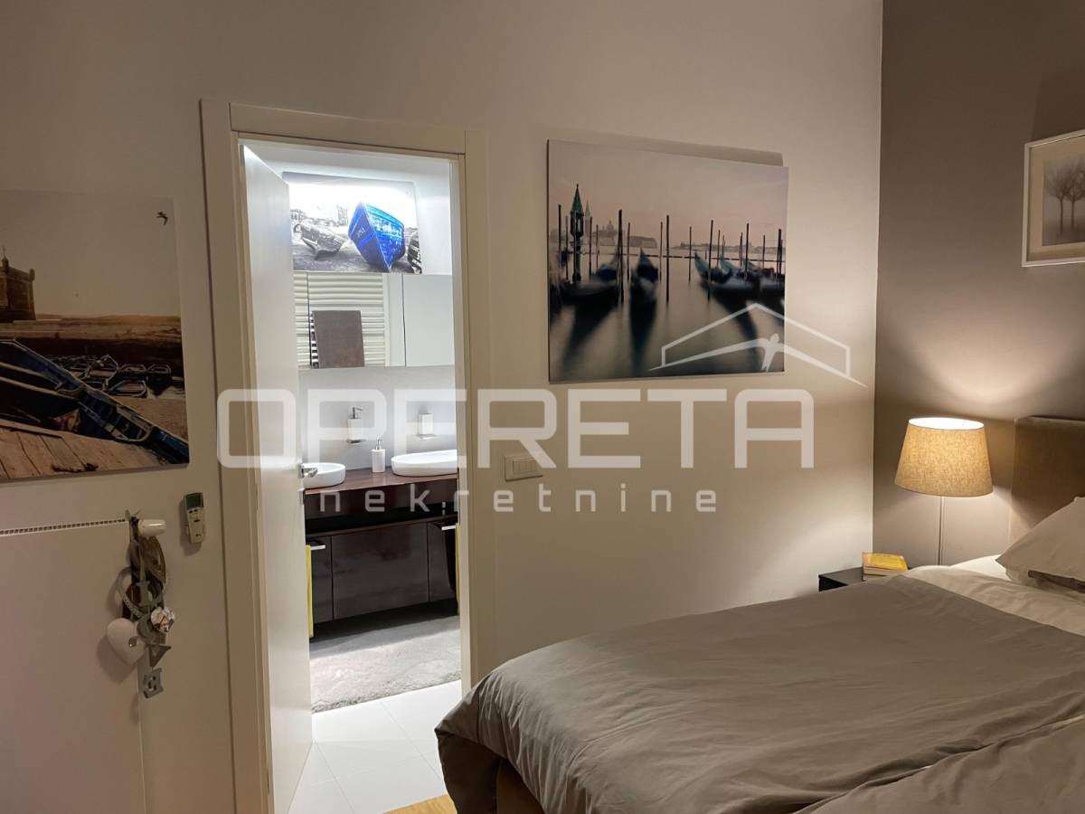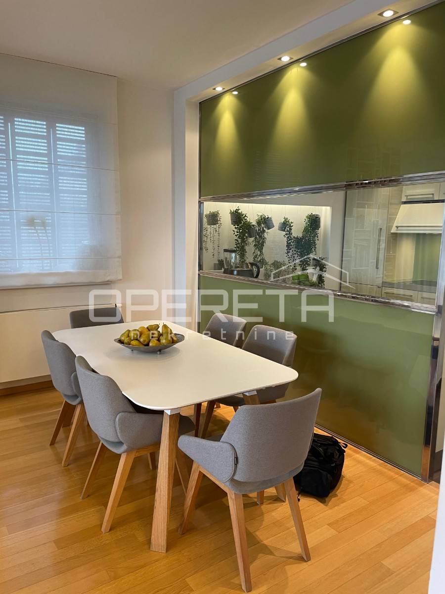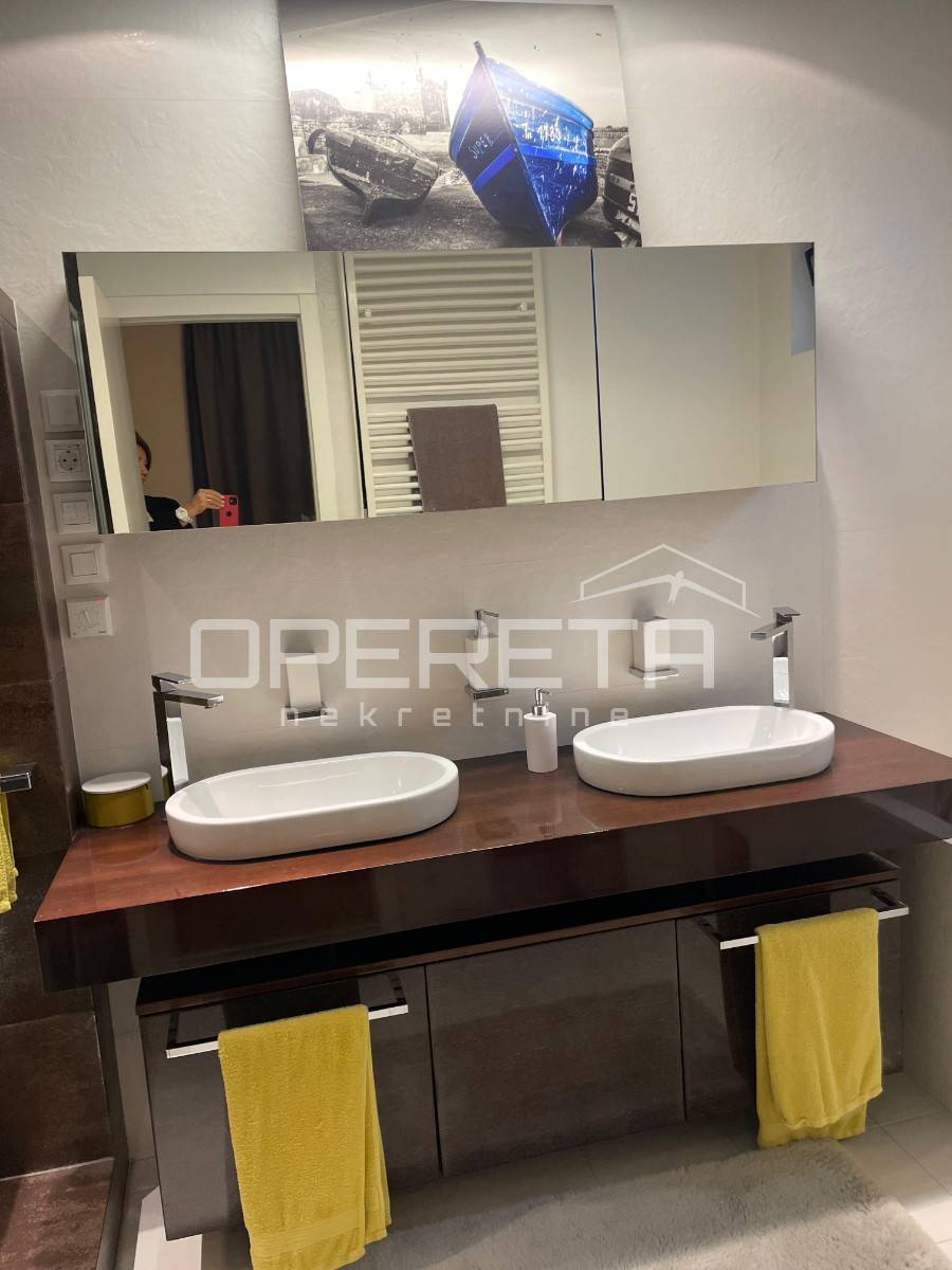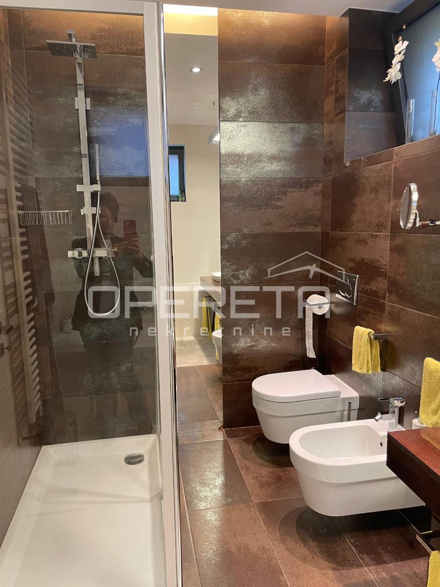 Prekrasno uređen i kompletno namješten trosoban stan površine 122 m2 na 2. katu novije gradnje s liftom. Sastoji se od ulaznog hodnika, prostranog dnevnog boravka s blagovaonicom, kuhinje, spavaće sobe s vlastitom kupaonicom (kada i tuš kabina), spavaće sobe, kupaonice s tušem, vešeraja te loggie (17,25 m2).Stanu pripadaju2 parkirna mjesta ispred zgrade.