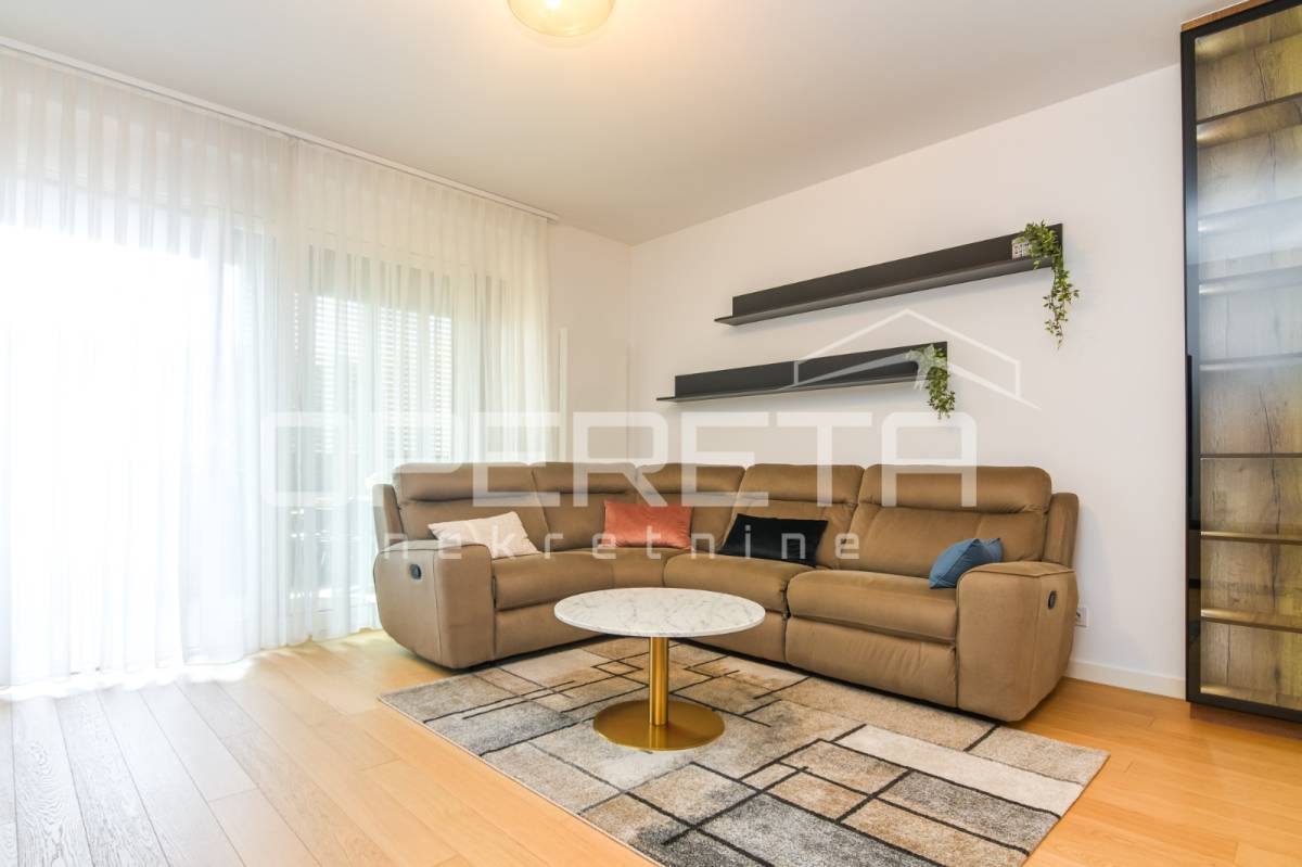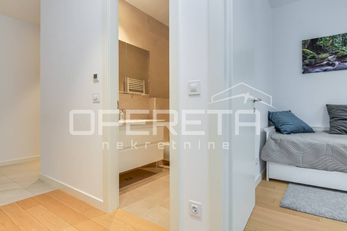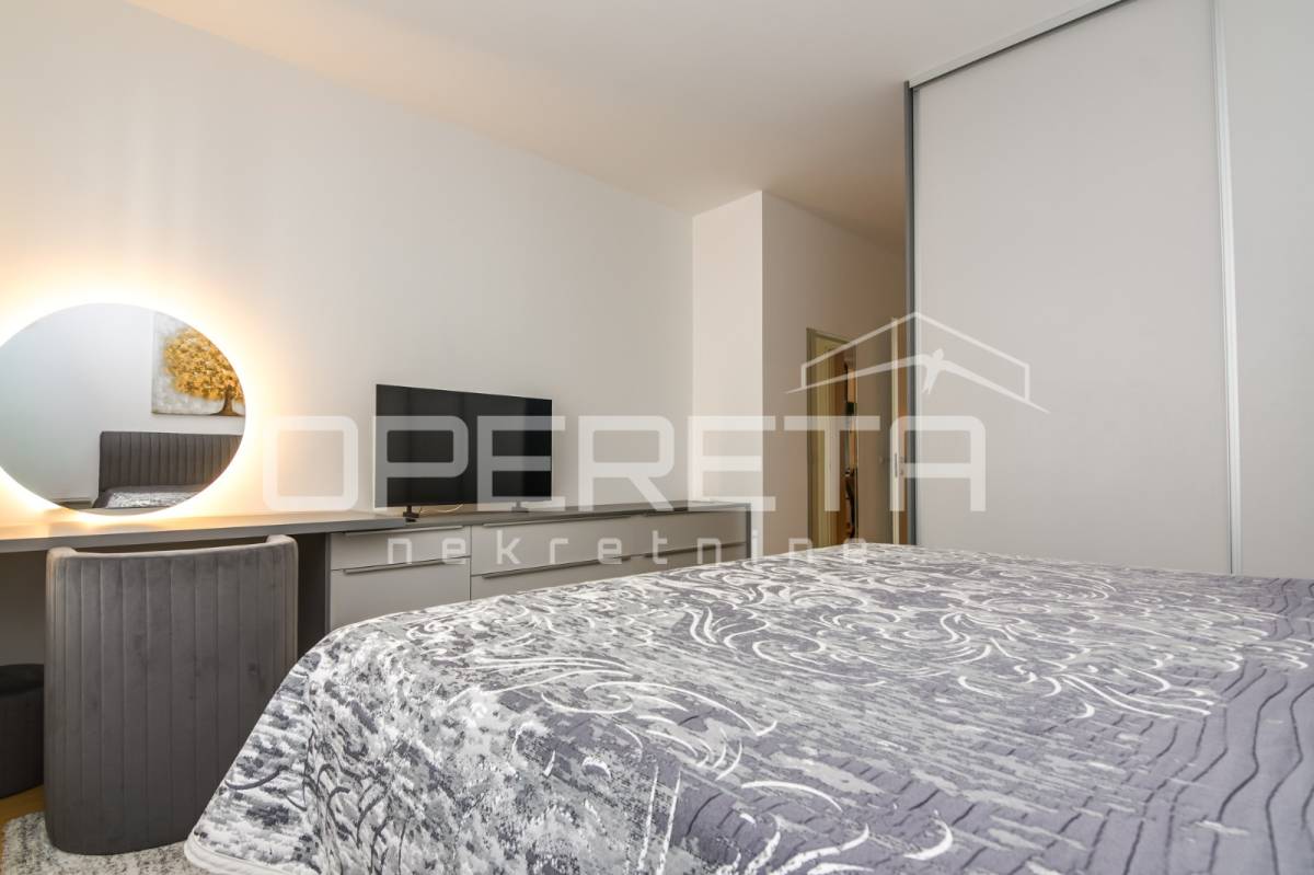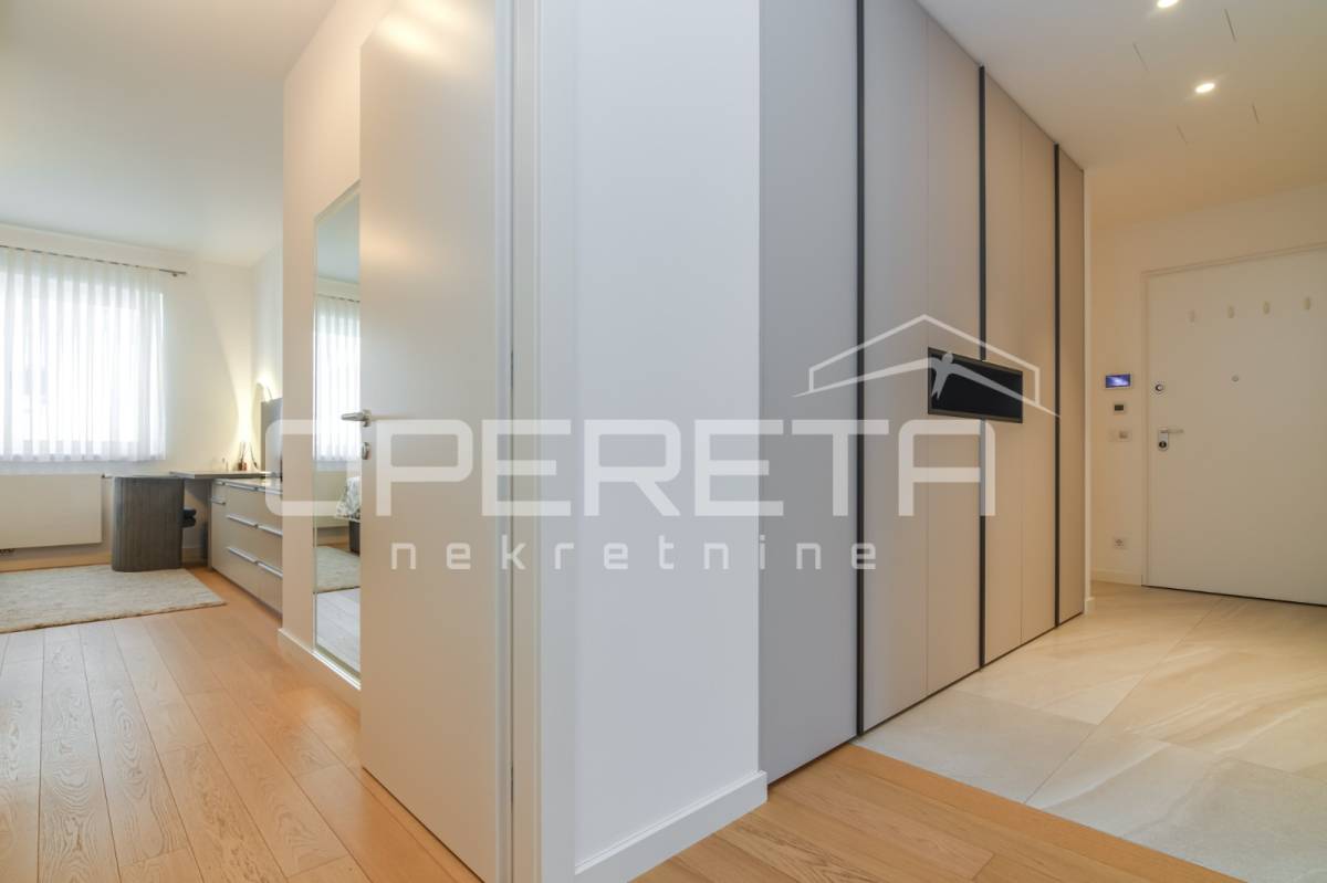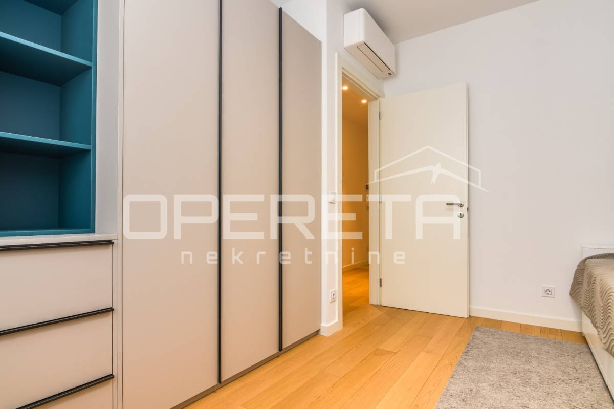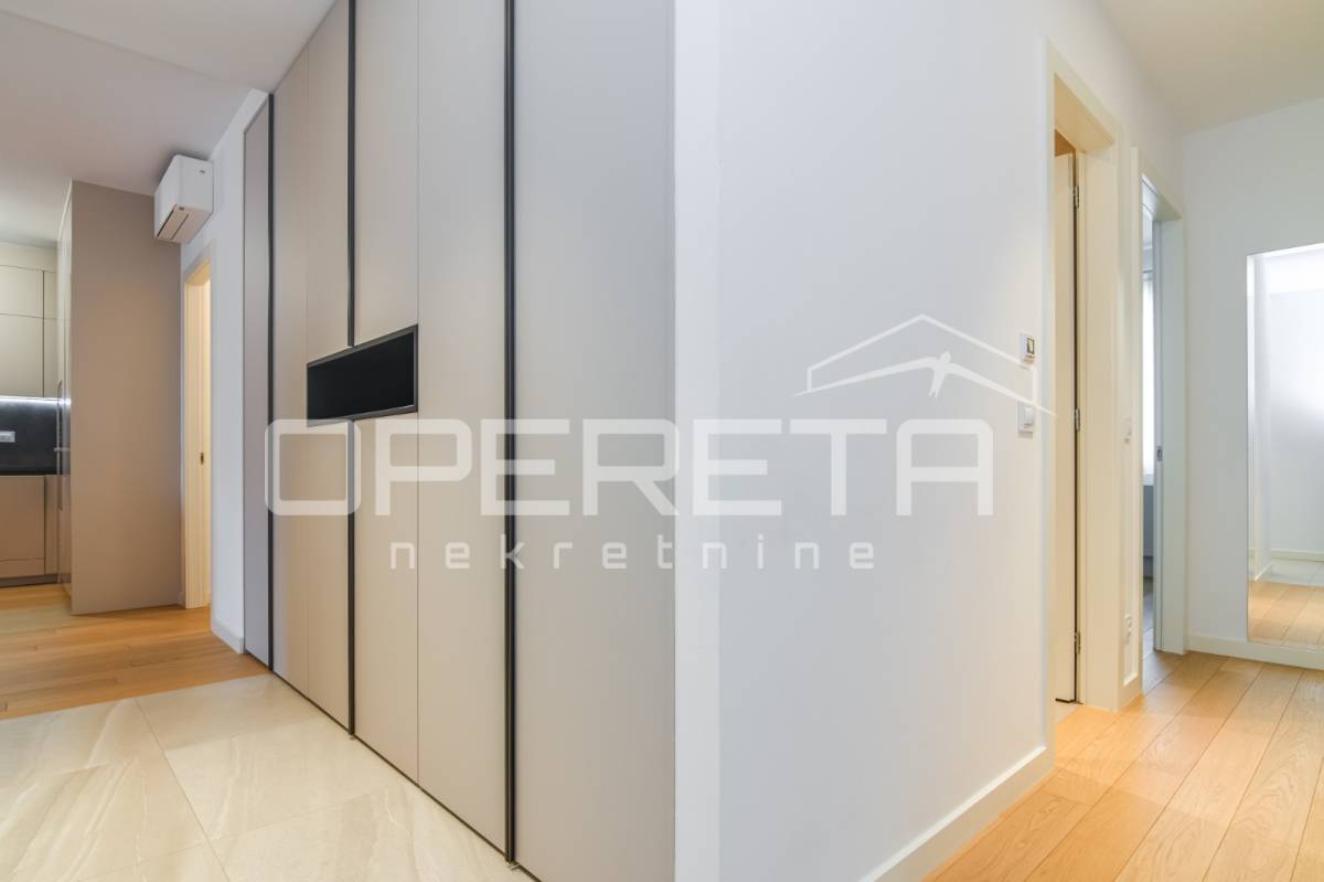 Iznajmjuje se stan u novogradnju koji se sastoji od ulaznog hodnika, dnevnog boravka s kuhinjom i blagovaonicom koji imaju izlaz na loggiu zapadne orijentacije, master spavaće sobe s vlastitom kupaonicom, vešeraj/ostava, 2 spavaće sobe i kupaonice. Stan je opremljen svim kućanskim aparatima, klimatiziran, ima sistem pametne kuće i alarmni sustav.