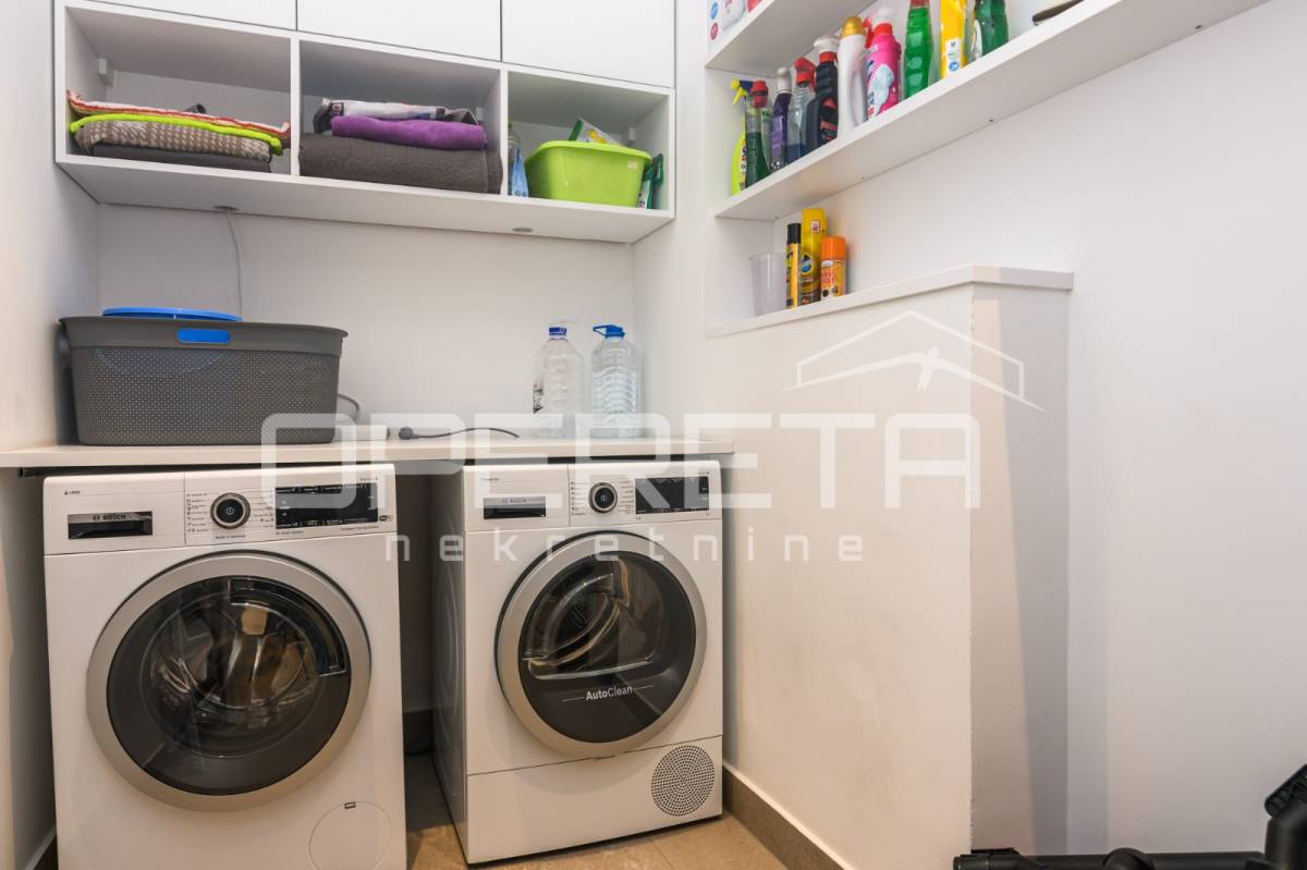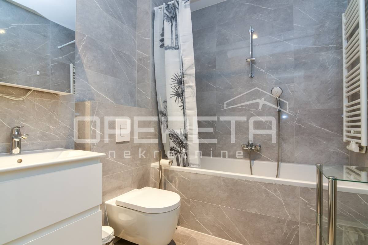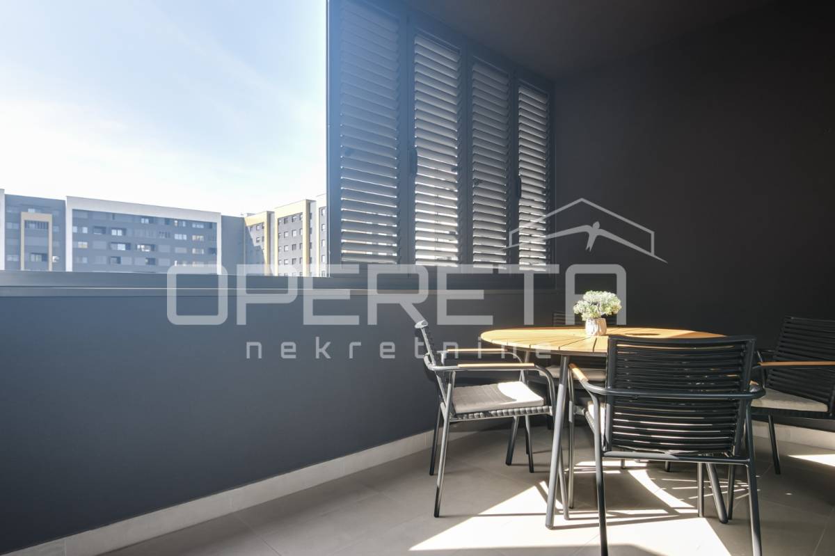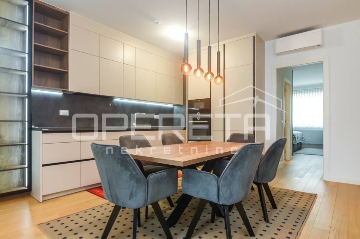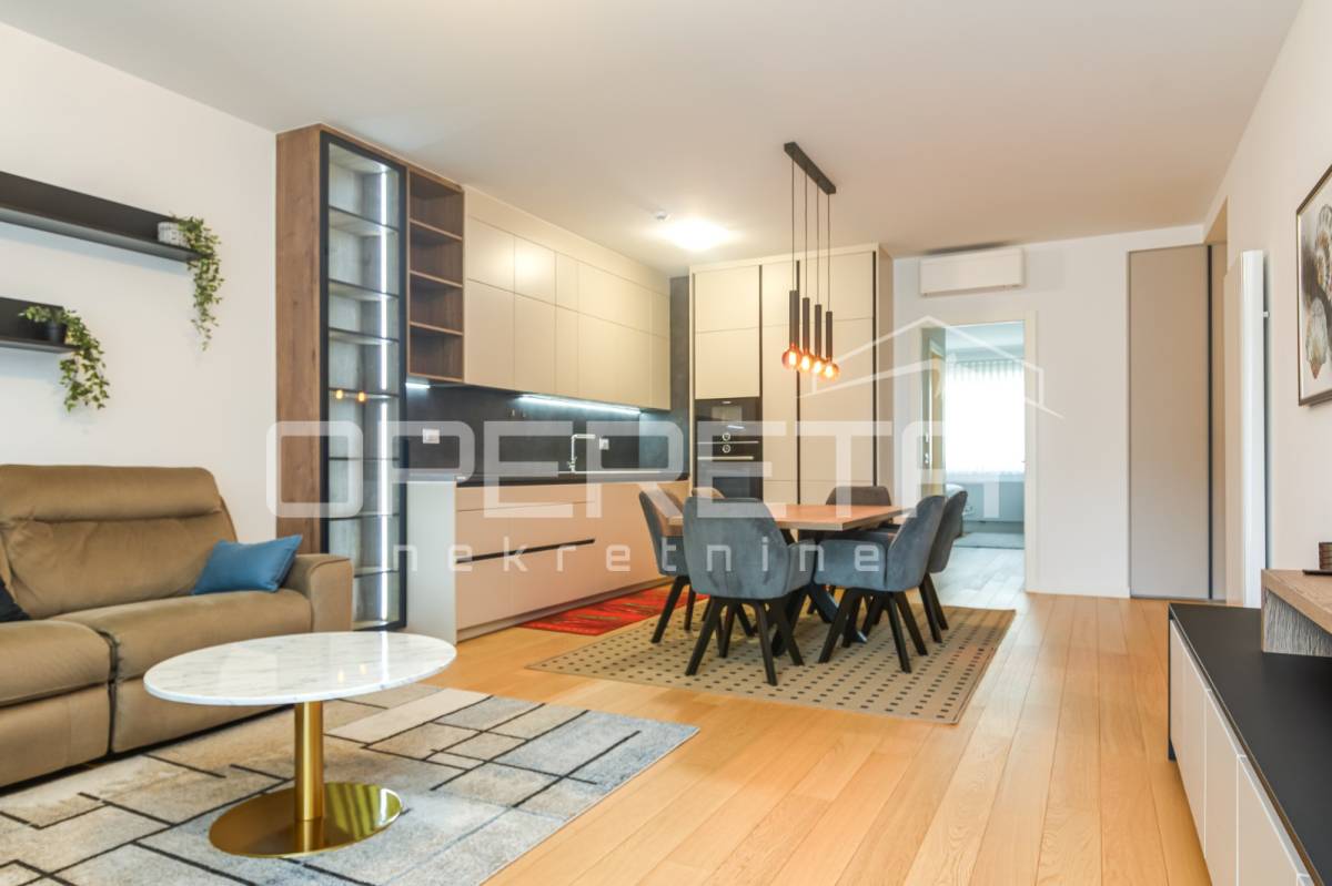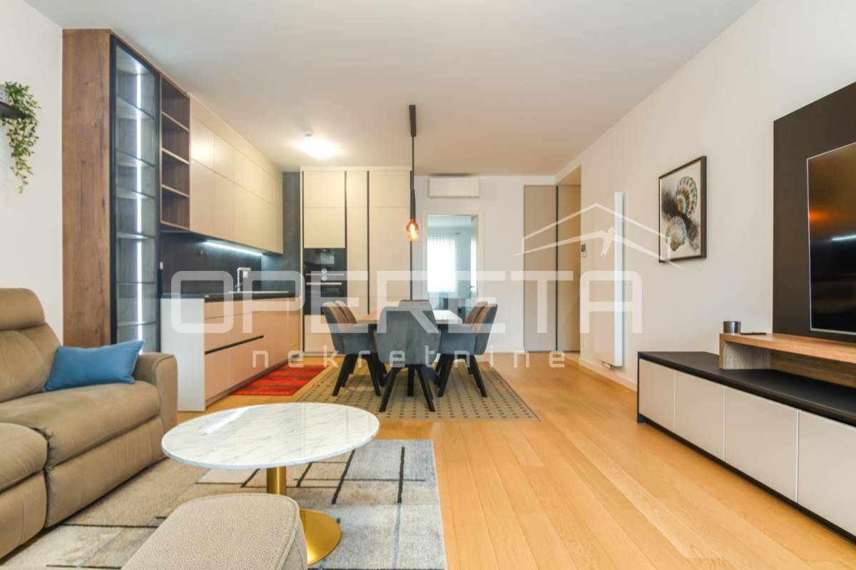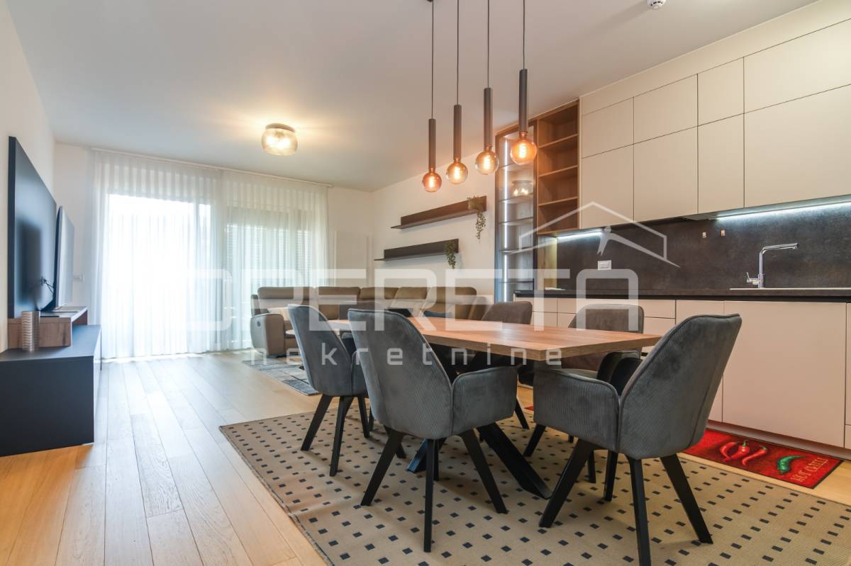 Iznajmjuje se stan u novogradnju koji se sastoji od ulaznog hodnika, dnevnog boravka s kuhinjom i blagovaonicom koji imaju izlaz na loggiu zapadne orijentacije, master spavaće sobe s vlastitom kupaonicom, vešeraj/ostava, 2 spavaće sobe i kupaonice. Stan je opremljen svim kućanskim aparatima, klimatiziran, ima sistem pametne kuće i alarmni sustav.
