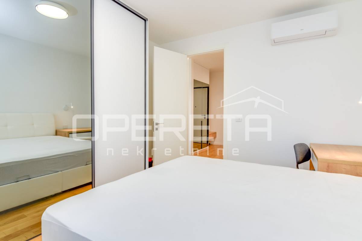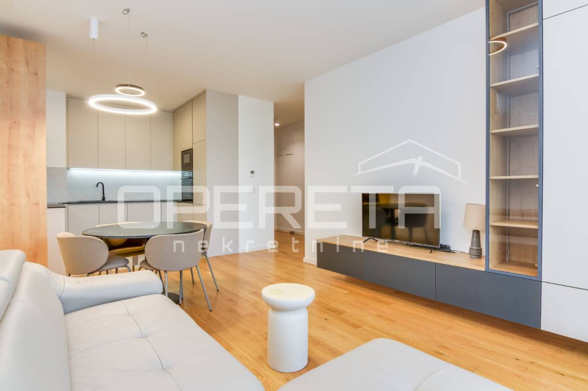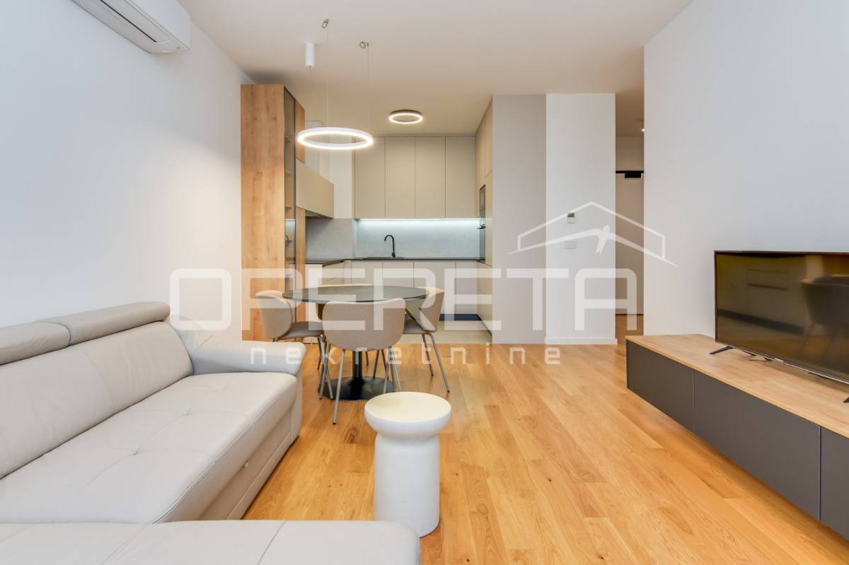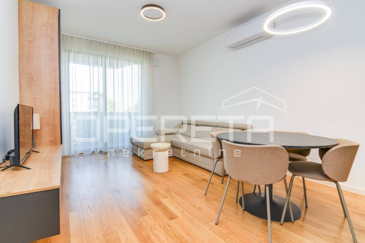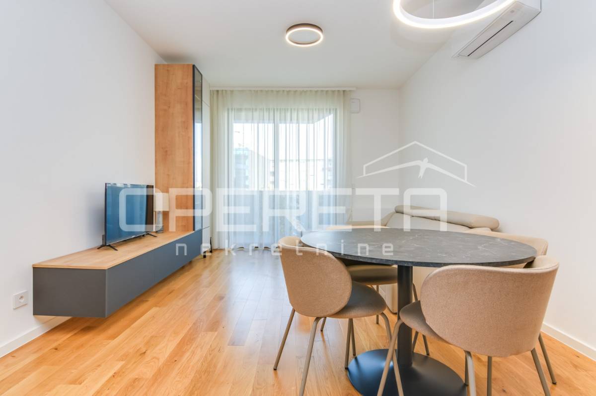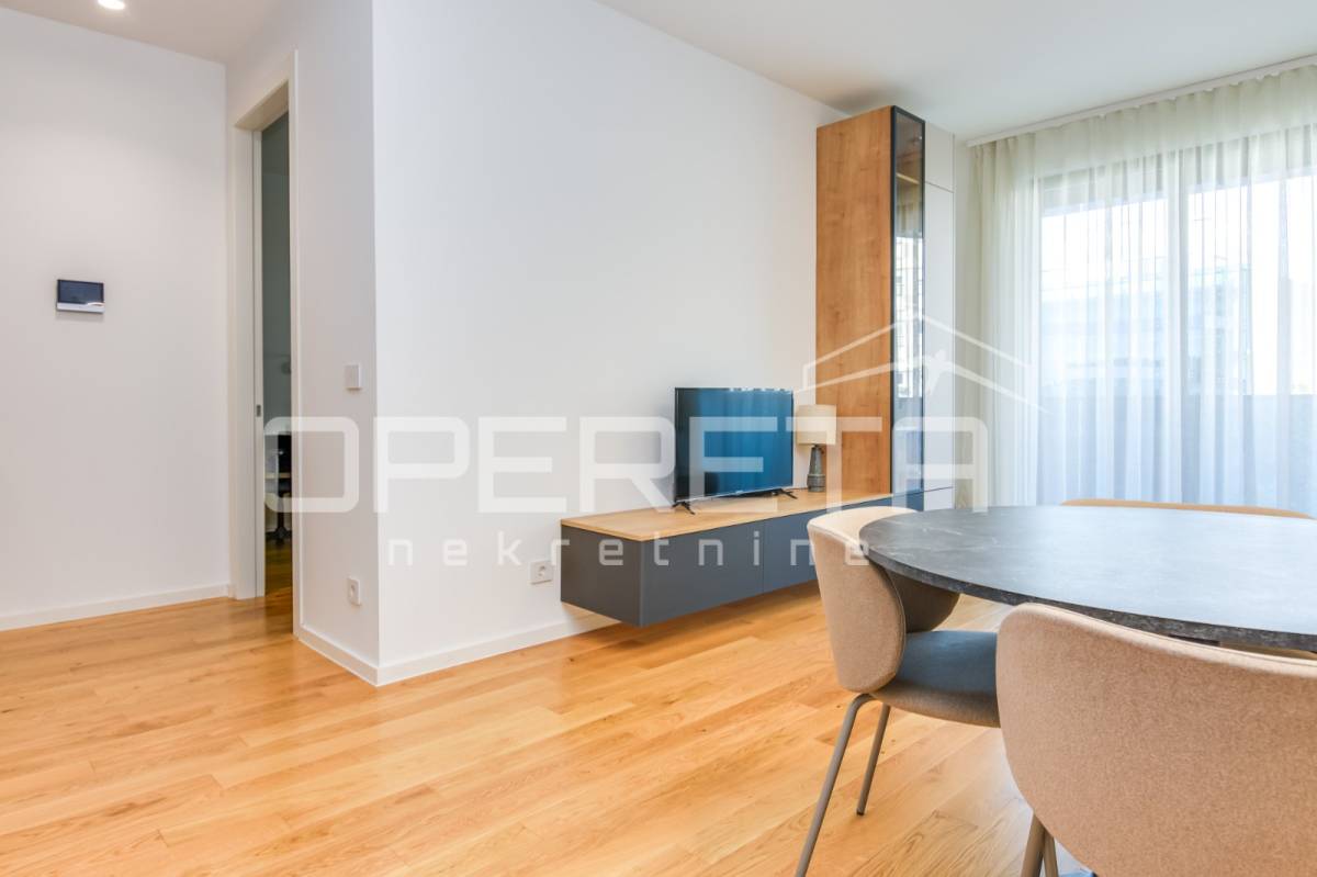 Iznajmljuje se prekrasan te luksuzno i moderno namješten i kompletno opremljen 2s stan od 56m2 na IV katu u izuzetno kvalitetnoj novogradnji (2023.g.) Stan se sastoji od: ulaznog prostora, open space dnevnog boravka sa blagovaonom i kuhinjom, prostrane spavaće sobe, kupaone s wc-om i natkrivene terase. Visina stropa iznosi 2,80m.