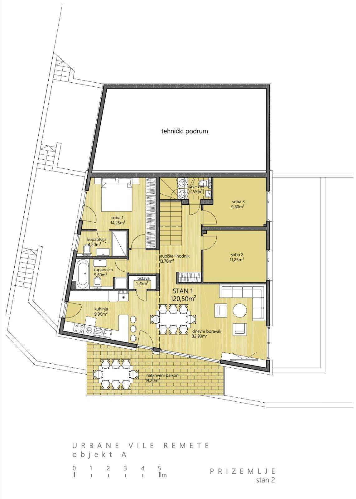 Stan se sastoji od dnevnog boravka s izlazom na terasu, vrhunski opremljene kuhinje, tri spavaće sobe, dvije kupaonice, toaleta s perilicama za rublje. Stanu pripadaju i dva parking mjesta (jedno natkriveno i jedno otvoreno) te tehnički podrum.