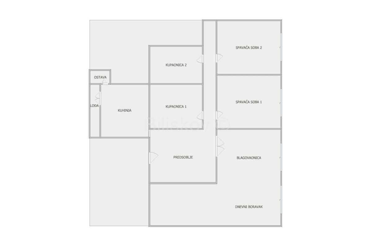 Stan se sastoji od ulaznog predsoblja, velikog “open space” prostora gdje se nalazi blagovaonica, dnevni boravak i biblioteka, zasebne kuhinje sa ostavom i izlazom na loggiu, hodnika, dvije spavaće sobe, dvije kupaonice i renoviranog spremišta u podrumu površine 6m2.