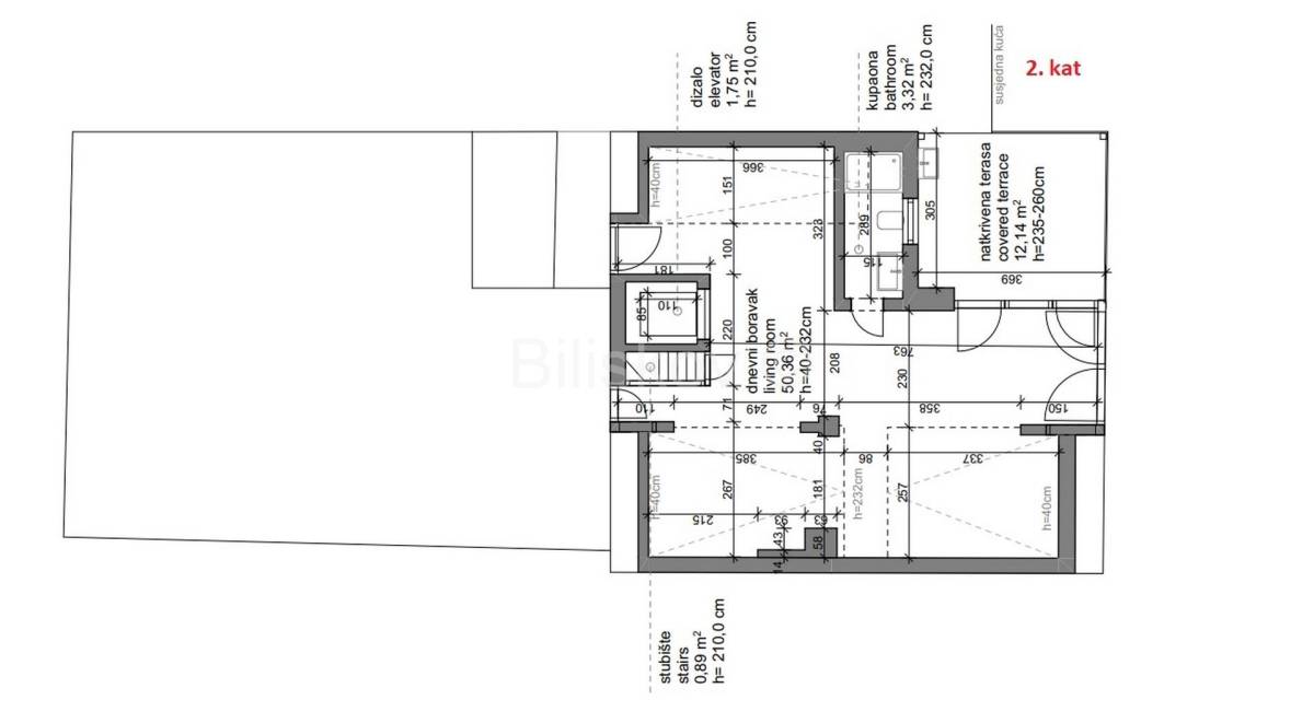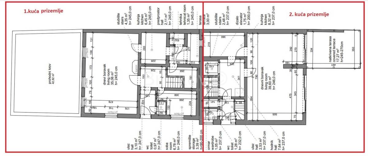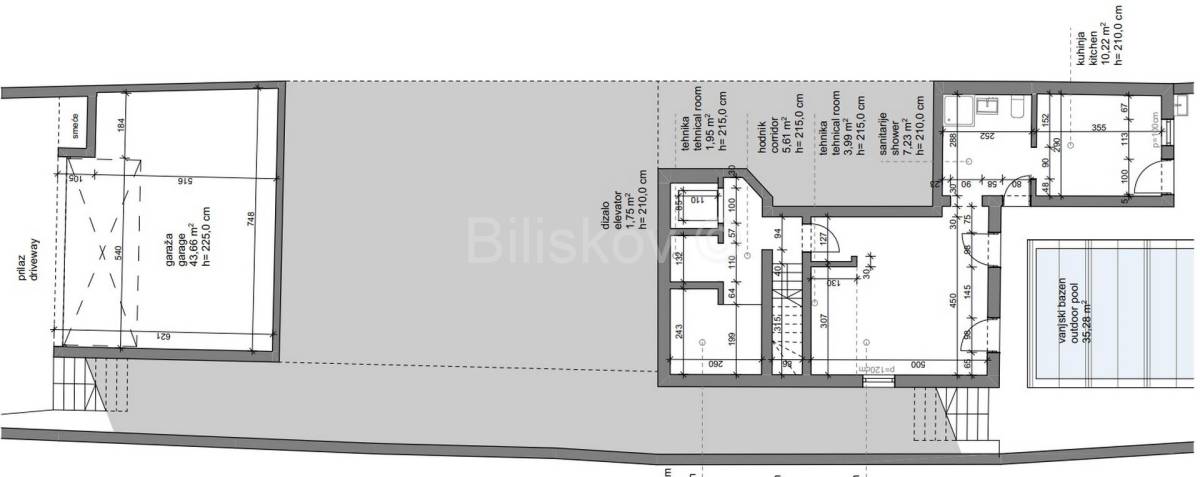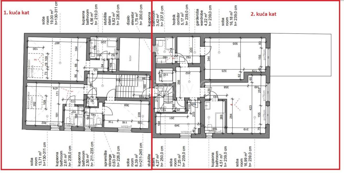Drugi dio kuće se sastoji od suterena u kojem se nalazi kotlovnica, kupaonica, tehnička prostorija za baze, lift koji povezuje sve 4 etaže druge kuće.