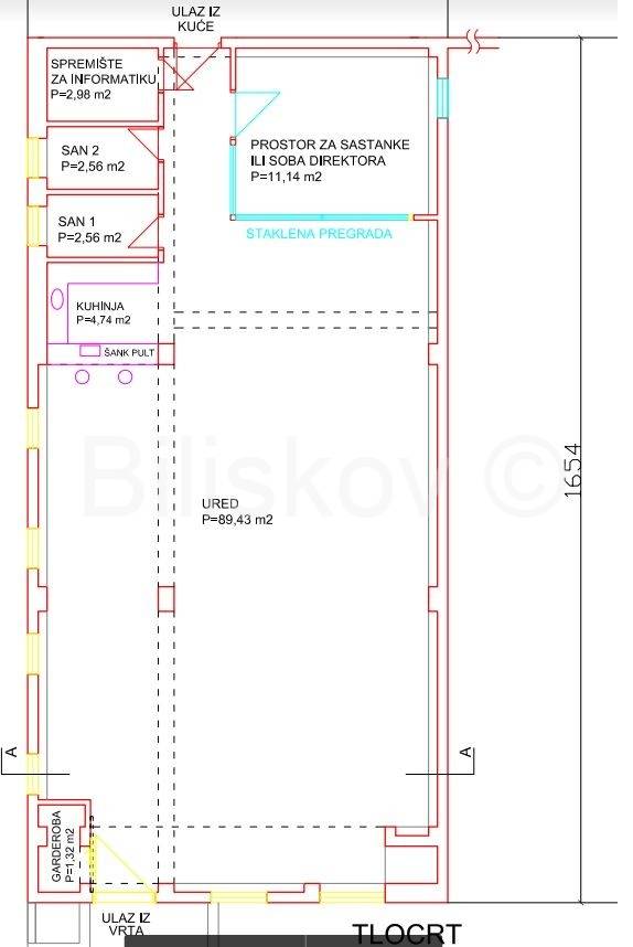 Izuzetno lijep i moderno namješten poslovni prostor ukupne neto površine 119,73m2 u prizemlju zgrade koja je građena 2008. godine. Zgrada nema dizalo. Ured je koncipiran kao „open space“, uz ured za sastanke odjeljen staklenim stijenama i staklenim vratima, priručnu kuhinju sa šankom, hladnjakom i perilicom suđa, muški i ženski sanitarni čvor, garderobu i spremište. Prostor je opremljen: priključkom za Internet , telefonom, klimatiziran u potpunosti, protuprovalnim sustavom, rasvjetnim tijelima po plafonu i zidovima s dovoljnim brojem utičnica 220V, crnim lakiranim stolovima, komodom za arhivu. Sve je funkcionalnom stanju, tako da Zakupac snosi troškove funkcionalnog održavanja zatečene opreme i namještaja. Sva trošila: struja, voda, plin su odvojena i zakupac ih može prebaciti na sebe zbog knjigovodstvenog knjiženja kao trošak. U prostoru je do sada bila informatička tvrtka. Lokacija je sjajna radi blizine infrastrukture važne za svakodnevni život te blizine autobusne stanice i pristupnih brzih prometnica.