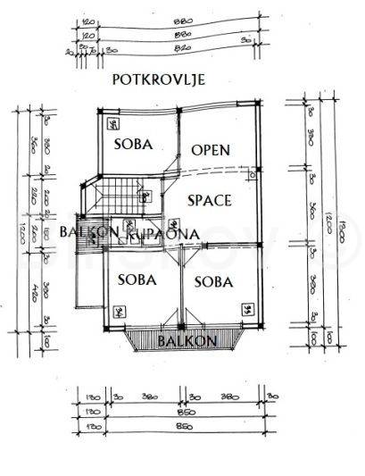 U Potkrovlju su: dvije sobe , veliki open space gdje jepredviđena kuhinja i dnevni boravak, kupaonica i dva balkona.