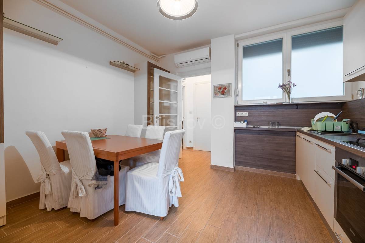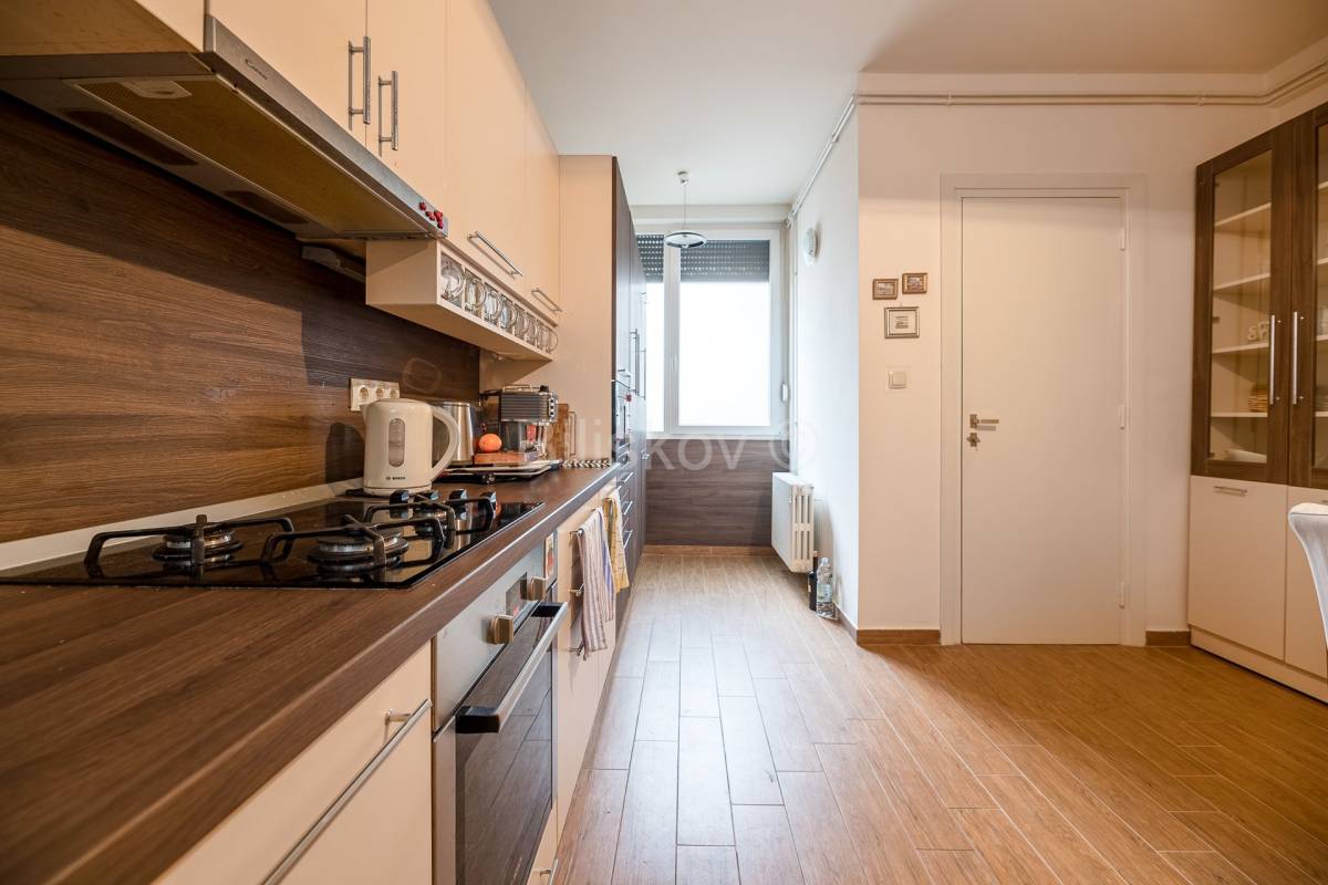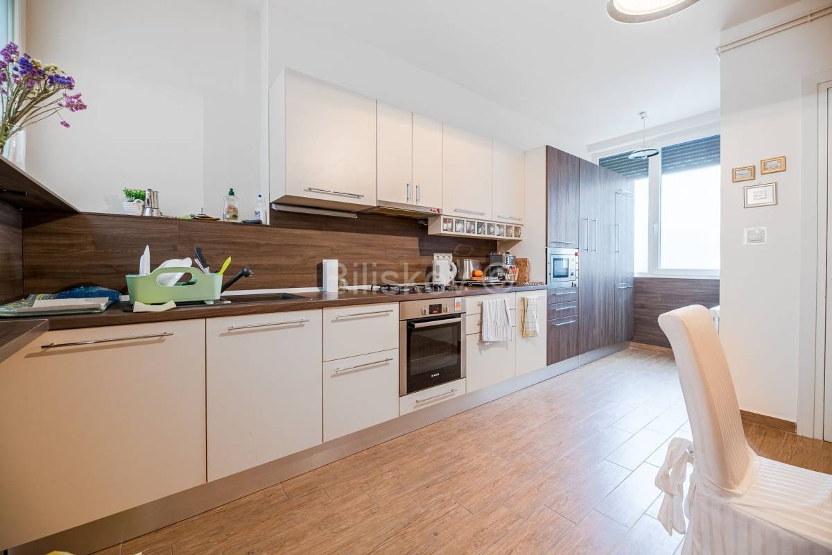 Stan je opremljen ugradbenim ormarima i vrhunski opremljenom kuhinjom. Grijanje je centralno etažno, u stanu se nalaze 3 unutarnje klima jedinice, a stolarija je alu – drvo.