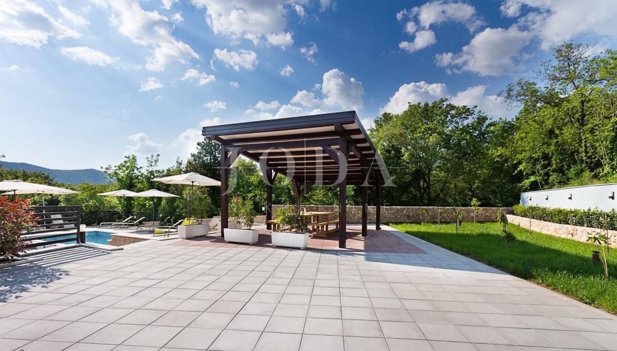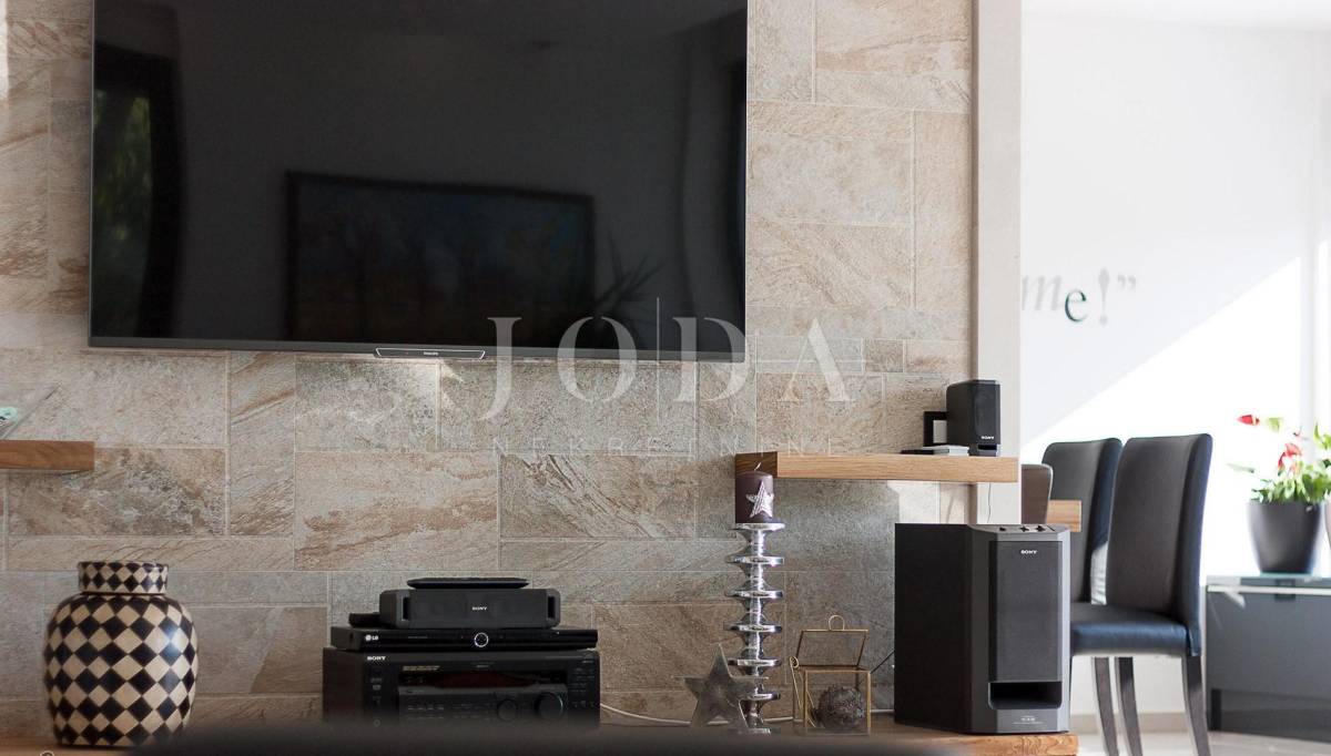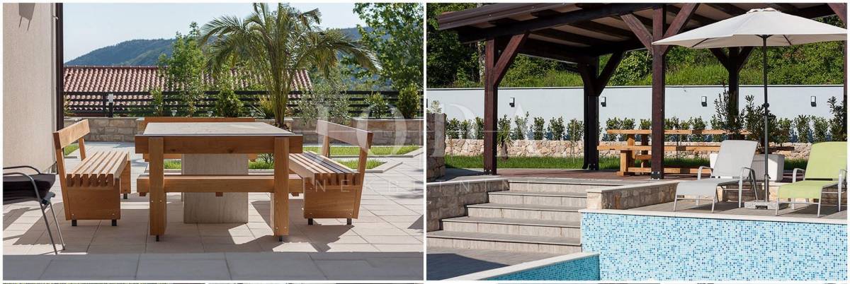 Iz dnevnog boravka izlazi se na terasu sa ljetnom kuhinjom i lounge dijelom koji je udaljen svega par koraka od atraktivnog bazena i sunčališta. Kompletno namještena. Na uređenoj okućnici površine 1313 m2 nalaze se nekoliko parkirnih mjesta. Mirna i lijepa lokacija, 3 km od mora.
