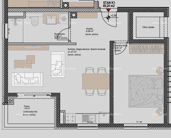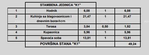 Stan K1, sastoji se od ulaznog hodnika, dnevnog boravka s kuhinjom i blagovaonom, spavaće sobe, kupaone i terase.
