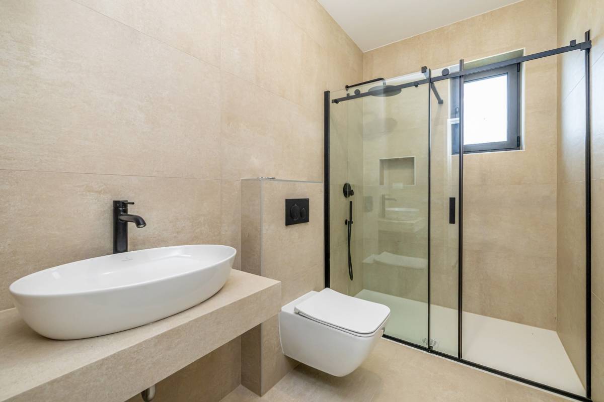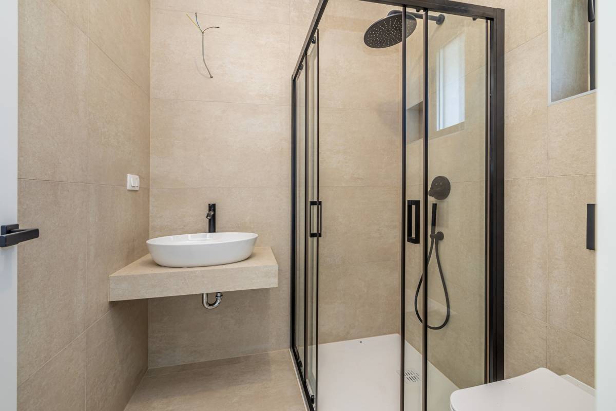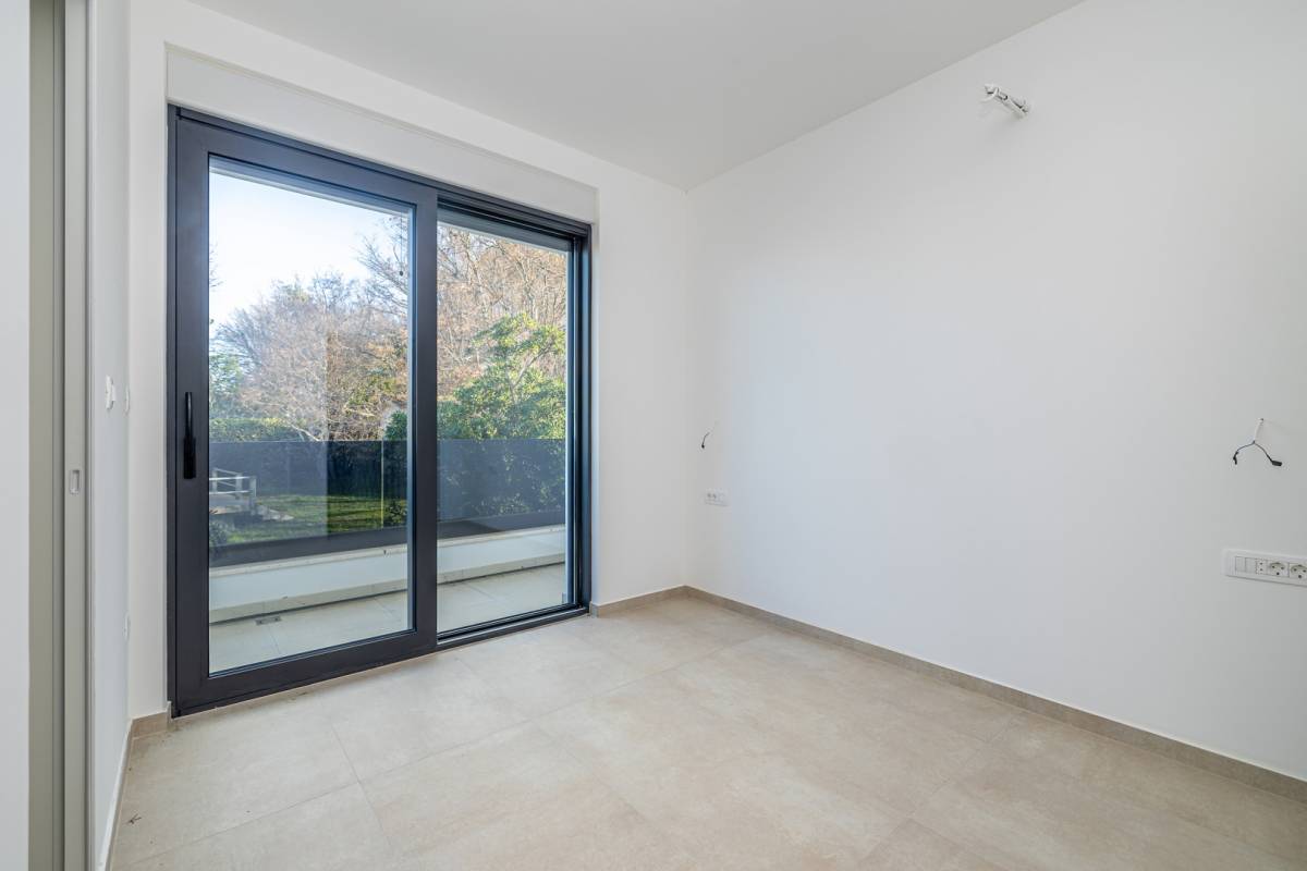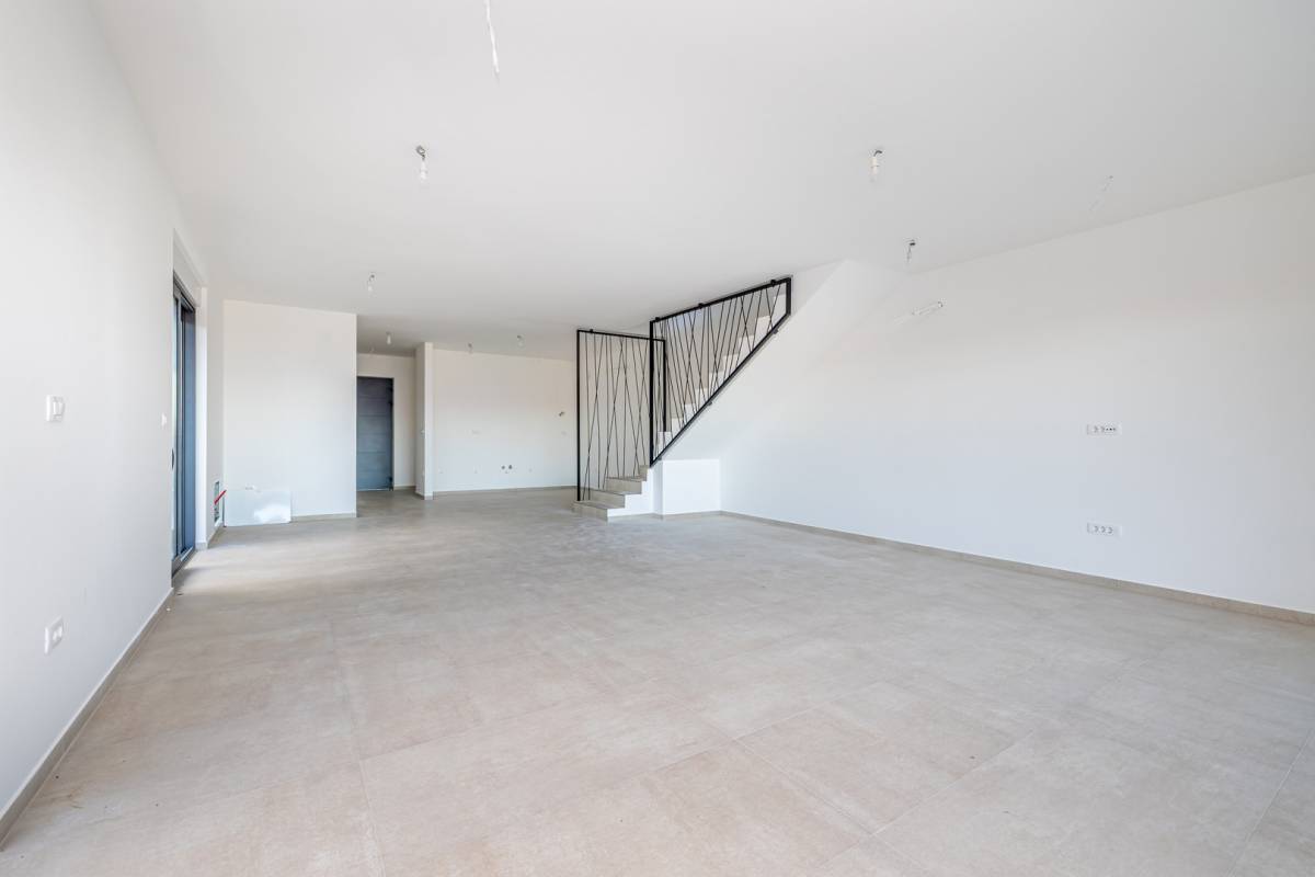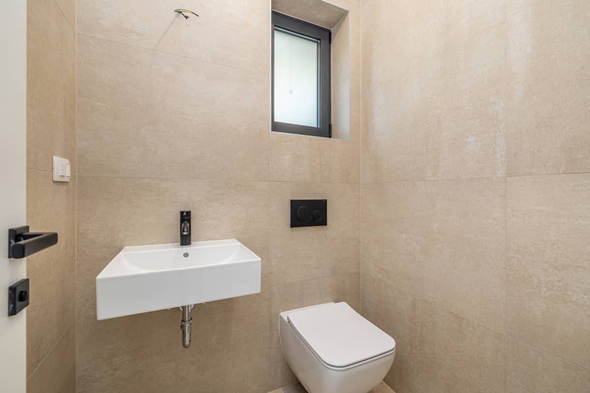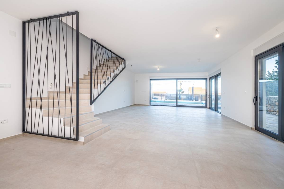 Ulaz u prizemlje vodi kroz prostrani hodnik, otkrivajući funkcionalno organiziran interijer s dodatnim spremištem i ostavom. Otvoreni koncept kuhinje s blagovaonicom te prostrani dnevni boravak čine središnji dio doma, obasjan prirodnim svjetlom koje dopire kroz velike staklene stijene. Odatle se izlazi na natkrivenu terasu i pažljivo uređenu okućnicu, gdje se smjestila ljetna kuhinja sa zidanim roštiljem, idealna za uživanje u toplim večerima. Dominantni element eksterijera je elegantan bazen sa sunčalištem, pružajući potpunu privatnost i luksuzan ambijent.