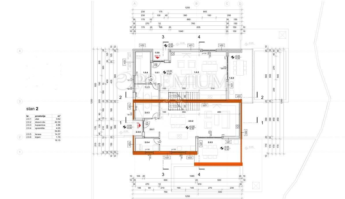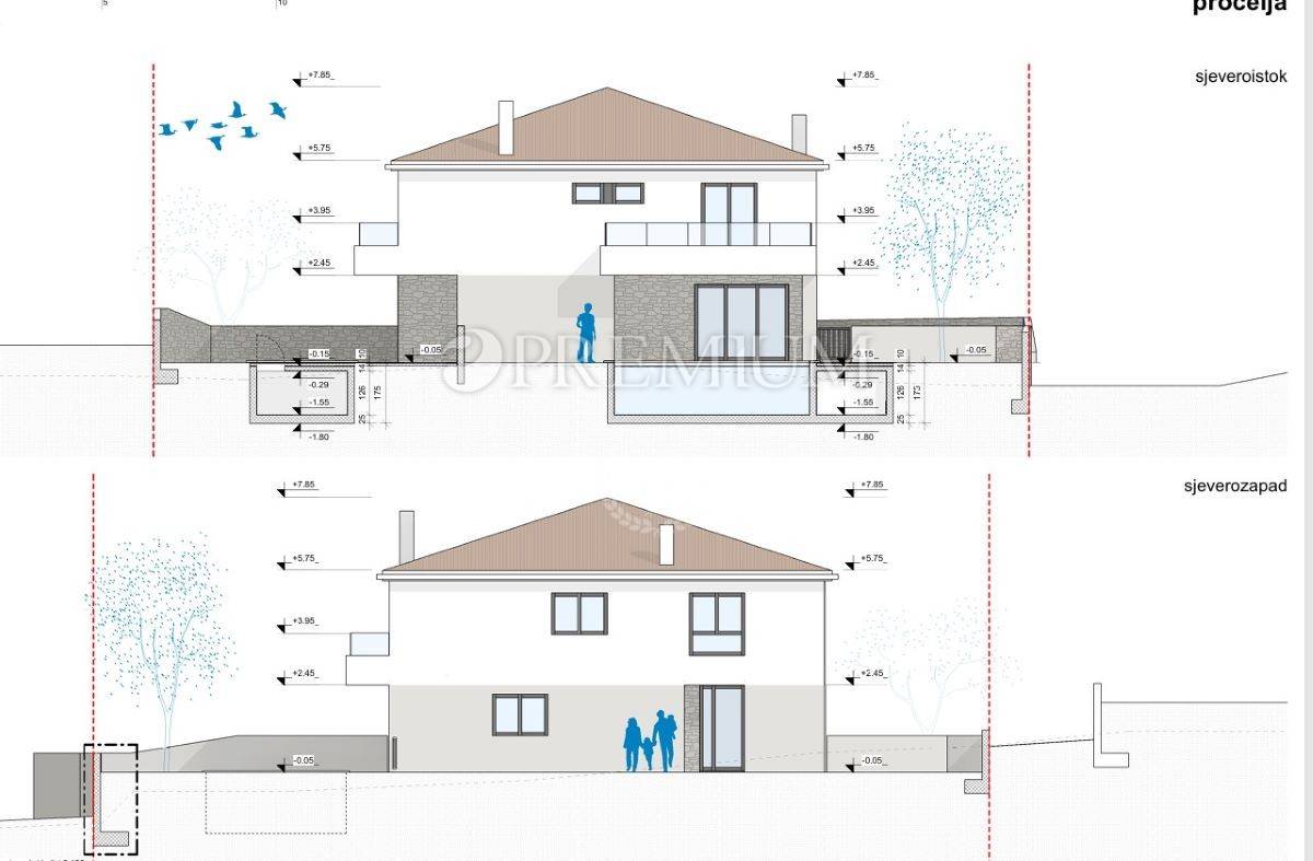 U prizemlju se nalazi ulazni prostor, kupaonica, moderna kuhinja povezana s blagovaonom i dnevnim boravkom u open space rasporedu te spremište. Iz dnevnog dijela izlazi se na natkrivenu terasu i okućnicu koja će biti kompletno uređena, a sadrži i privatni bazen veličine 3 x 8 metara. Na parceli su osigurana dva parkirna mjesta.