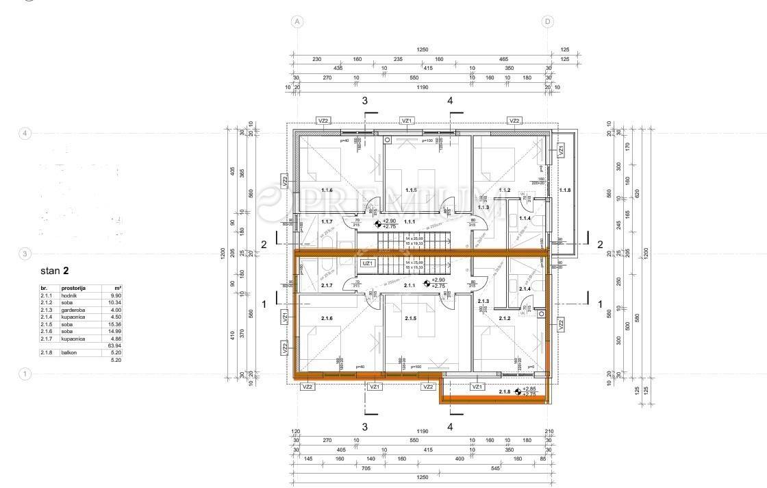 Interne stepenice vode na kat gdje su smještene tri spavaće sobe, hodnik i kupaonica. Master spavaća soba ima vlastitu kupaonicu, te balkon s lijepim pogledom na more.
