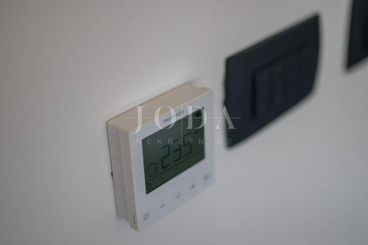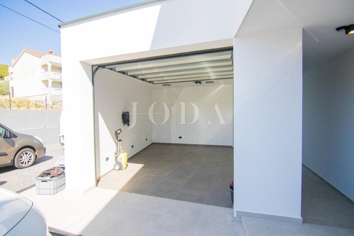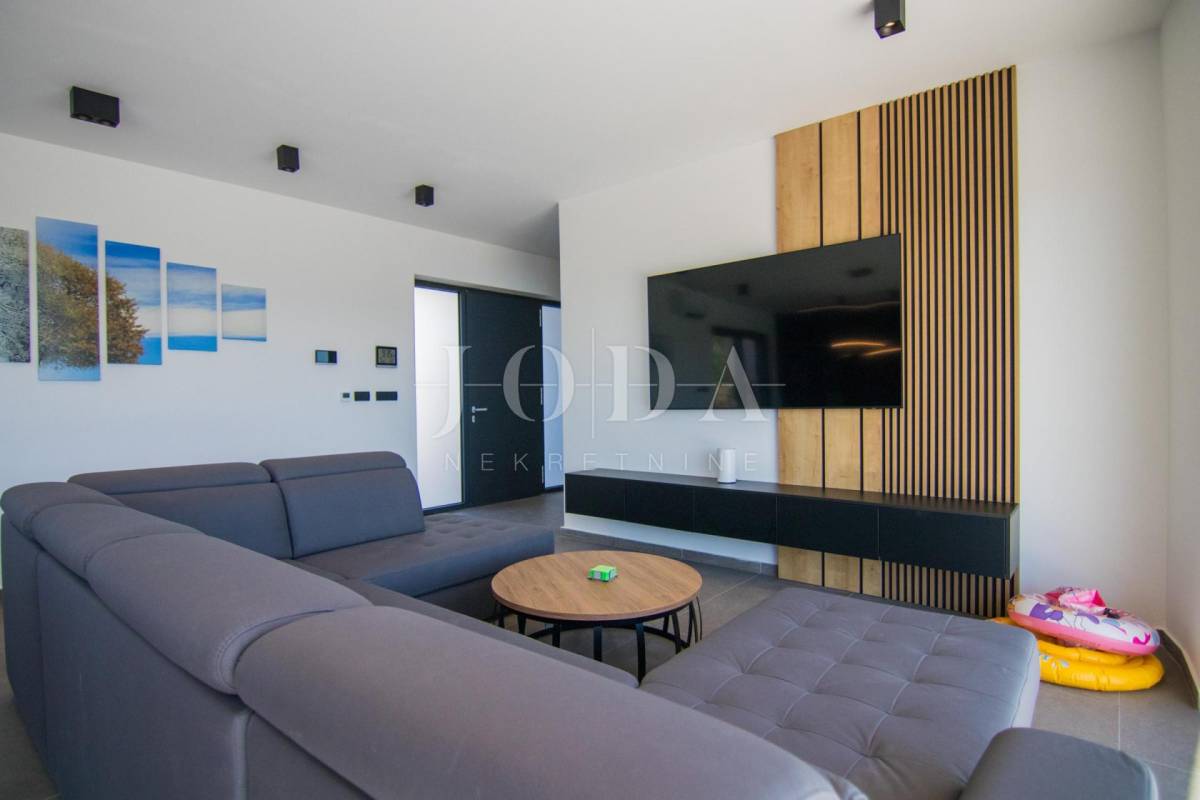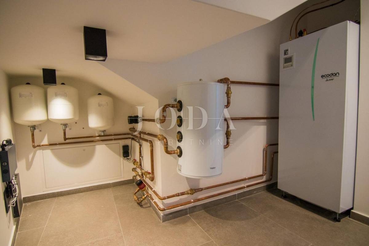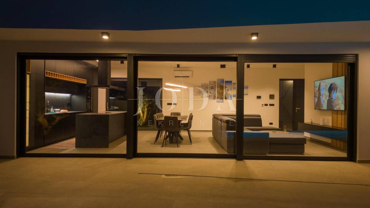 Kuća ukupne stambene površine 180 m² proteže se na prizemlje i kat. U prizemlju se nalaze garaža površine 21,70 m², prostrani dnevni boravak s kuhinjom i blagovaonicom, spremište s perilicom i sušilicom rublja, hodnik, kupaonica te prostorija za vježbanje (teretana).