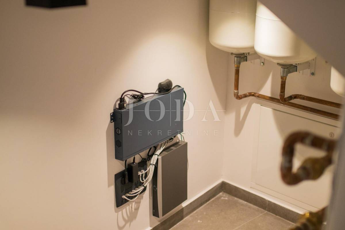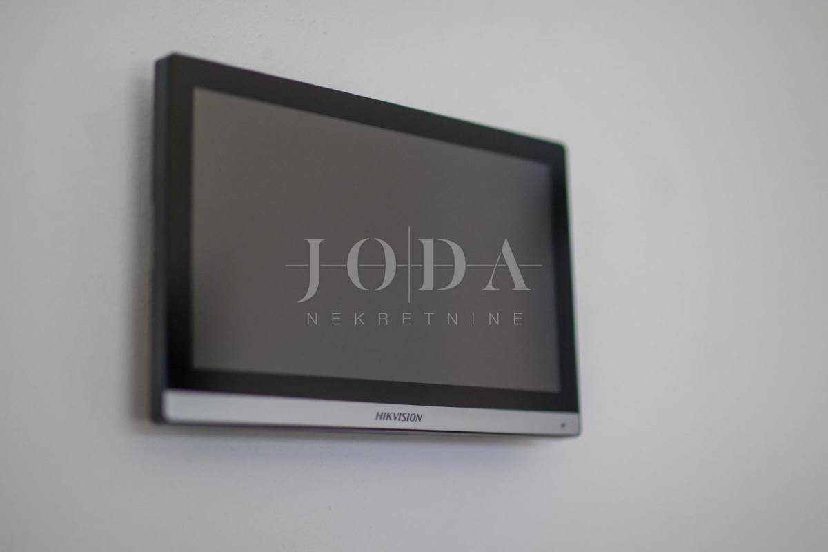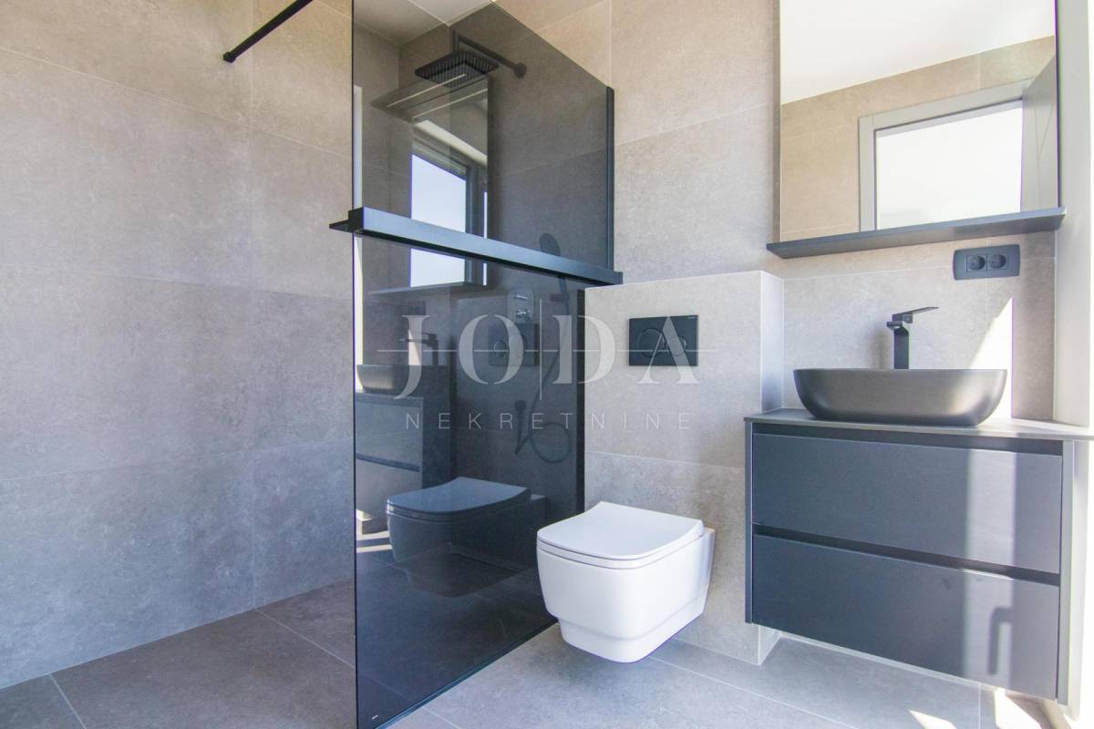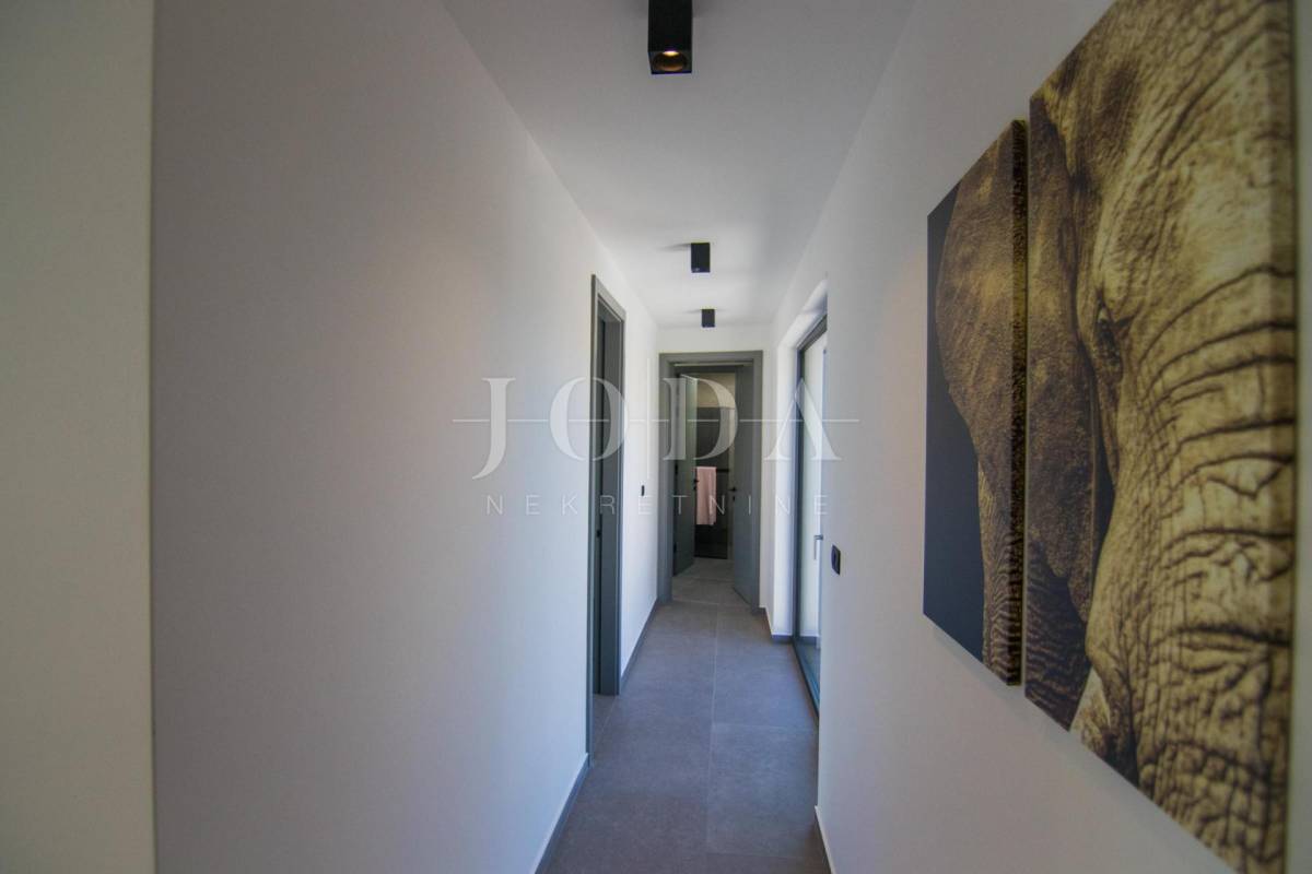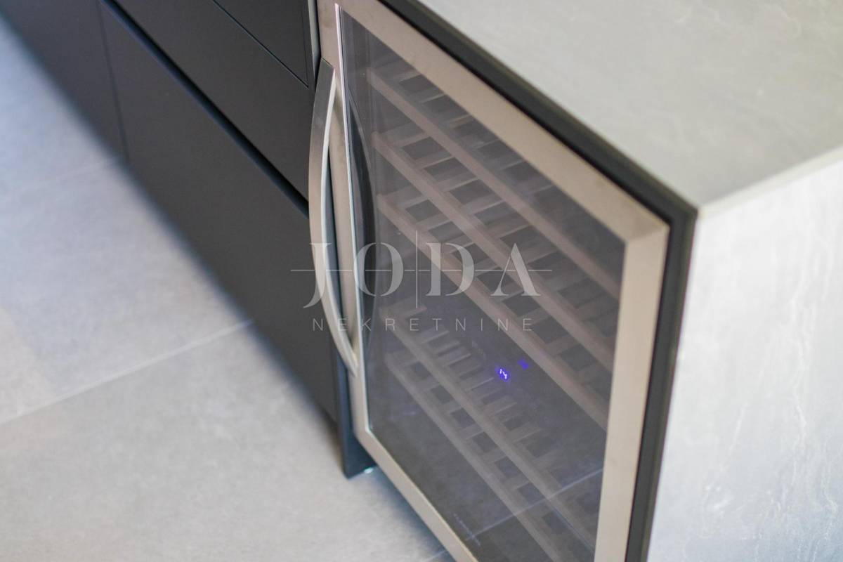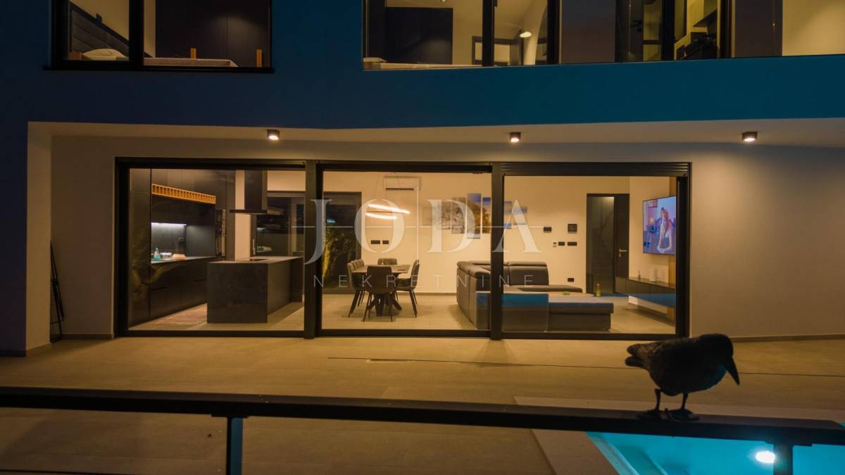 Kuća ukupne stambene površine 180 m² proteže se na prizemlje i kat. U prizemlju se nalaze garaža površine 21,70 m², prostrani dnevni boravak s kuhinjom i blagovaonicom, spremište s perilicom i sušilicom rublja, hodnik, kupaonica te prostorija za vježbanje (teretana).