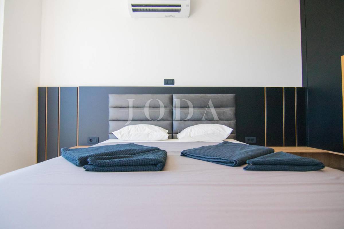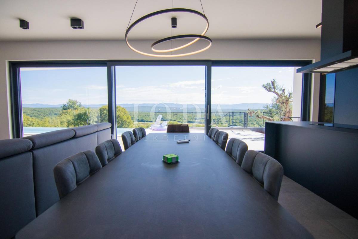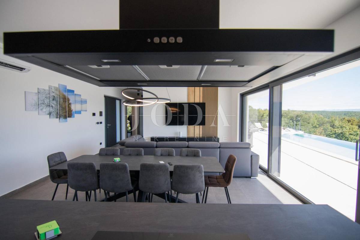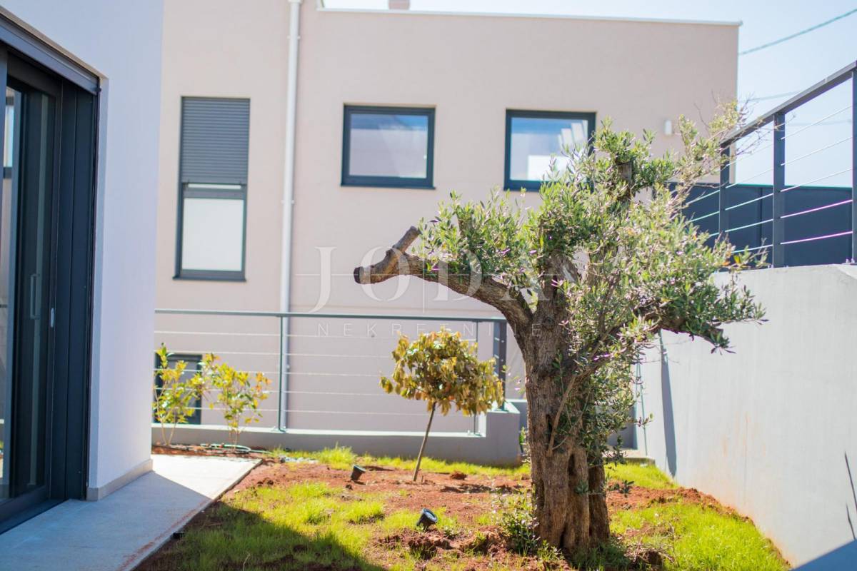 U uređenom dvorištu smještena je natkrivena terasa površine 33,60 m², sunčalište, preljevni bazen površine 42 m² te roštilj.