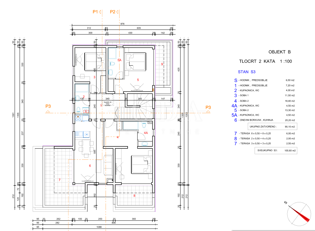 Dvosobni stanovi su koncipirani tako da se lako mogu podijeliti na dva(studio te jednosobni),sa balkonima što ih čini idealnima za turistički najam pogotovo u mjestu kao što je Novalja,koja ima odličnu popunjenost.