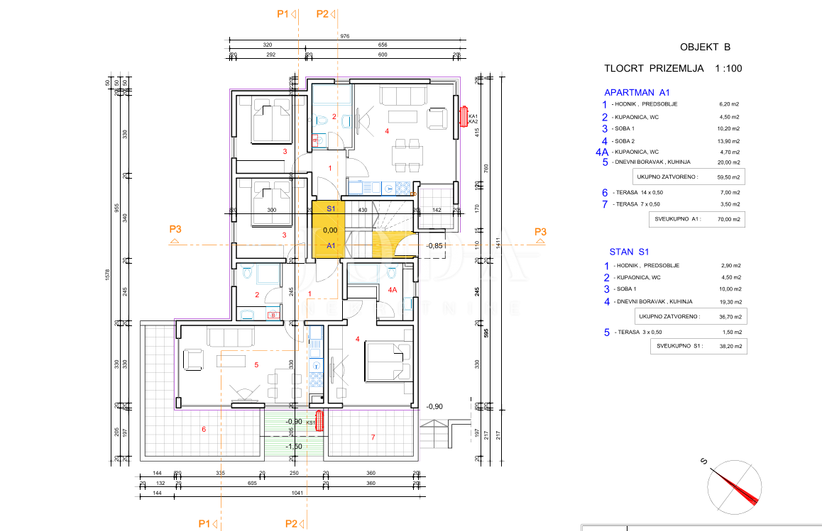 Dvosobni stanovi su koncipirani tako da se lako mogu podijeliti na dva(studio te jednosobni),sa balkonima što ih čini idealnima za turistički najam pogotovo u mjestu kao što je Novalja,koja ima odličnu popunjenost.