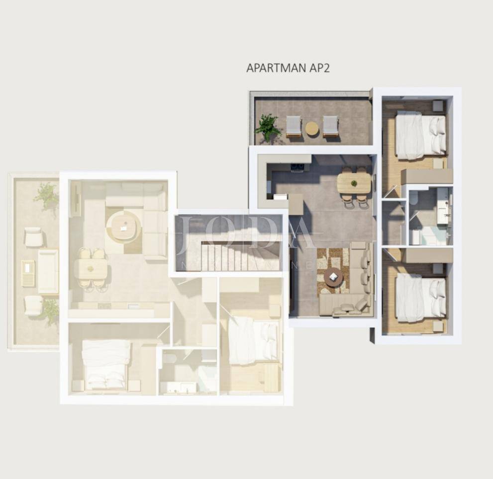 Prizemni stan u vlasništvu ima veliku okućnicu, dok svi ostali stanovi imaju lijepe balkone te prekrasan pogled na more. Planirani završetak radova je ljeto 2025. godine