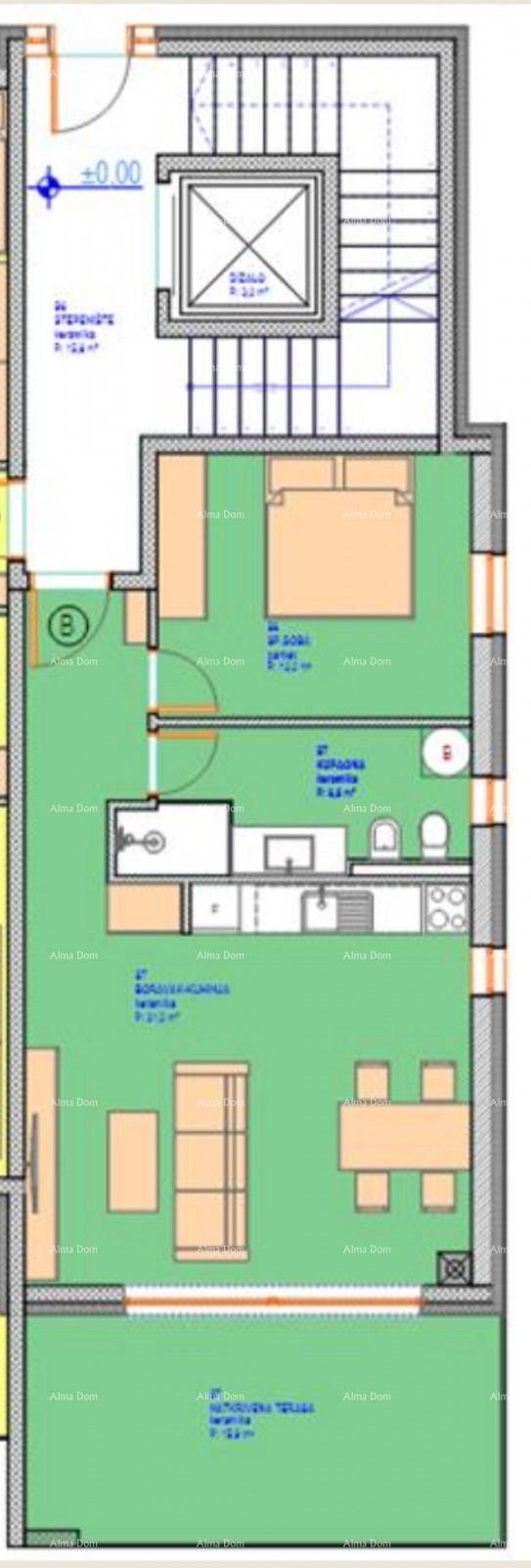 Stan tip B, nalazi se u prizemlju zgrade s liftom i sastoji od ulaznog dijela, dnevnog boravka s kuhinjom i blagavaonom, spavaće sobe, kupaone i velike terase.
