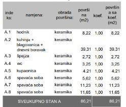 Stan 1 nalazi se u prizemlju zgrade A i sastoji se od hodnika, dnevni boravak s kuhinjom i blagavaonom, špajz, toalet, kupaona, tri spavaće sobe i vrta od 60 m2.