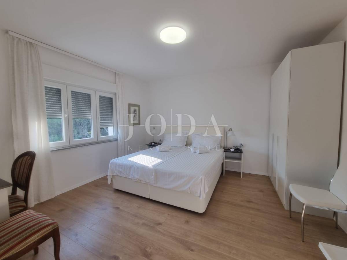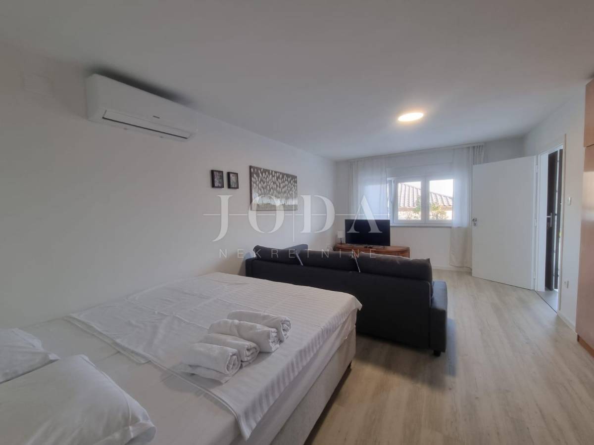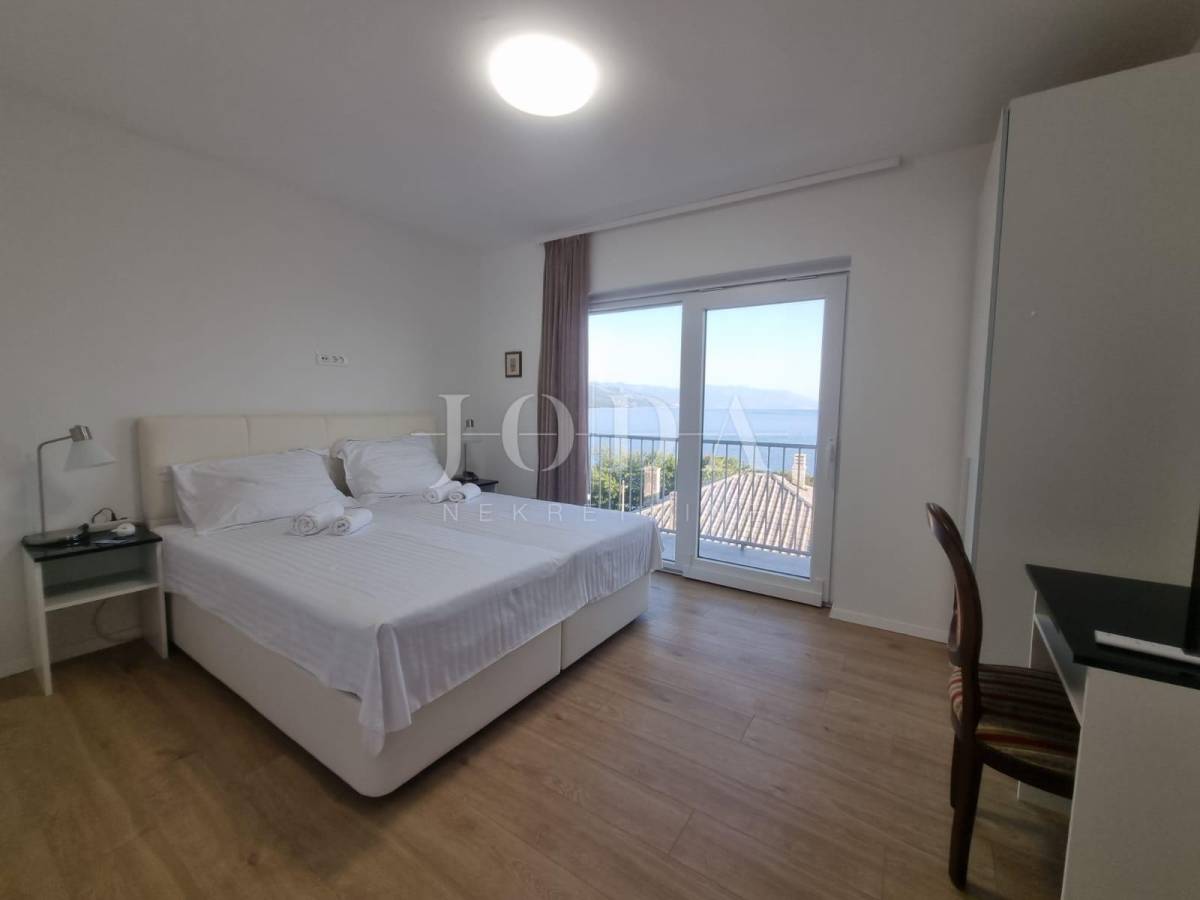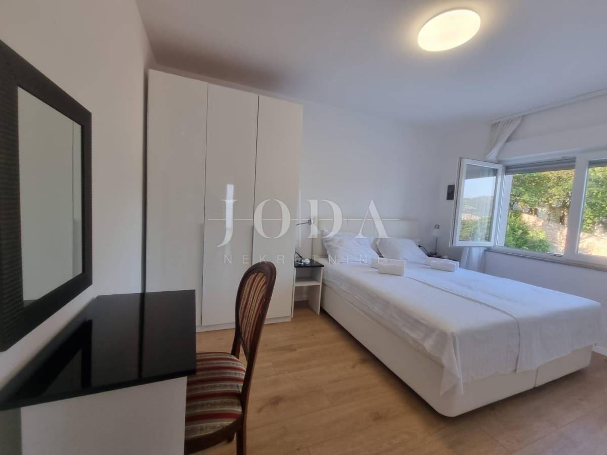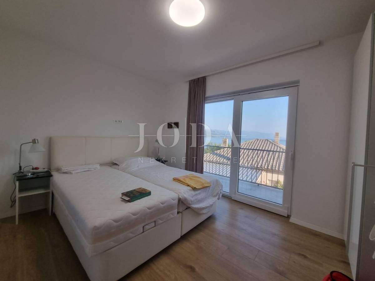 Na posljednoj etaži nalazi se trosobni stan. Sve etaže imaju pogled na more. Unutar prostrane okućnice nalazi se garaža od 40m2 i bazen od 32m2 sa sjenicom i sunčalištem te obezbjeđenim parkingom za pet automobila. Prve dvije etaže prilagođene su osobama sa invaliditetom. Cijela kuća je klimatizirana i u potpunosti namješetna i spremna za korištenje. Svi priključci se mogu odvojiti. Nekretnina zbog fanatstične lokacije i novoizgrađenosti prilika za investiciju ali i za odmor i uživanje preko cijele godine.