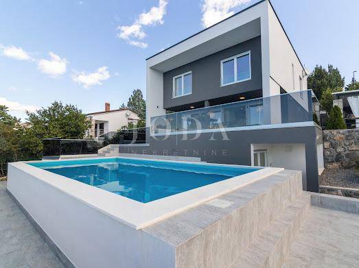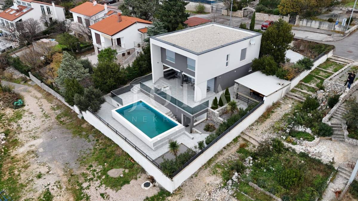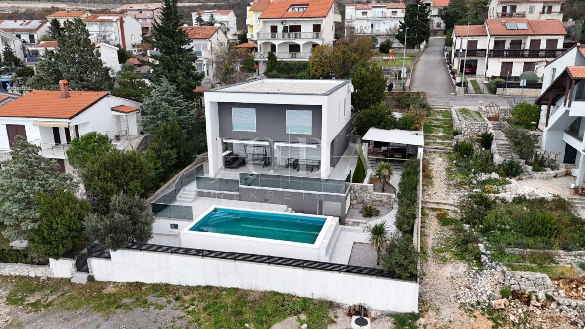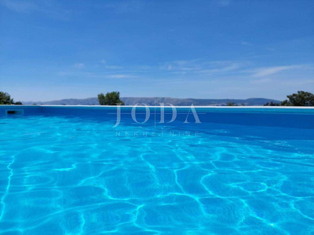 Sama kuća se sastoji od prizemlja unutar kojega je smješten gostinjski wc,soba,praonica i veliki dnevni boravak sa kuhinjom i blagavaonicom koji su povezani sa vanjskim dijelom,natkrivenom terasom te bazenom i sunčalištem.