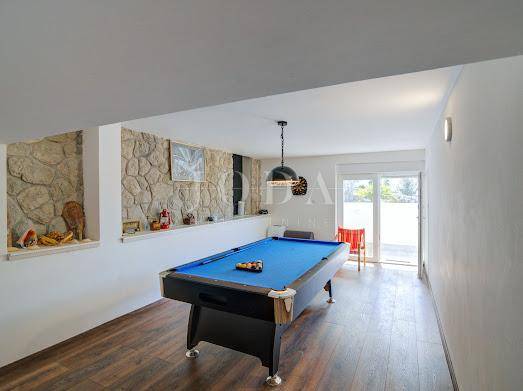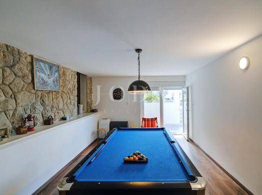 Unutarnje stepenice vode na kat gdje su spavaće sobe sa kupaonicama .U suterenu je još prostor konobe sa bilijarom koji služi kao soba za razonodu,te u nastavku iste pomoćni prostor za ostavu raznih ležaljki,bazenske tehnike i sl.