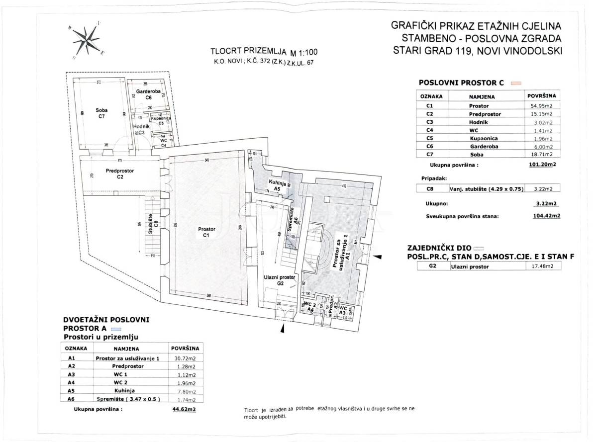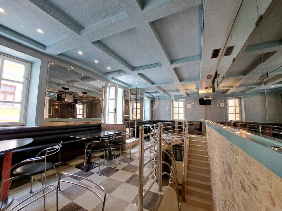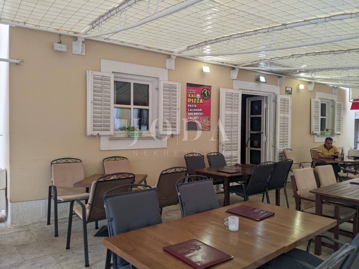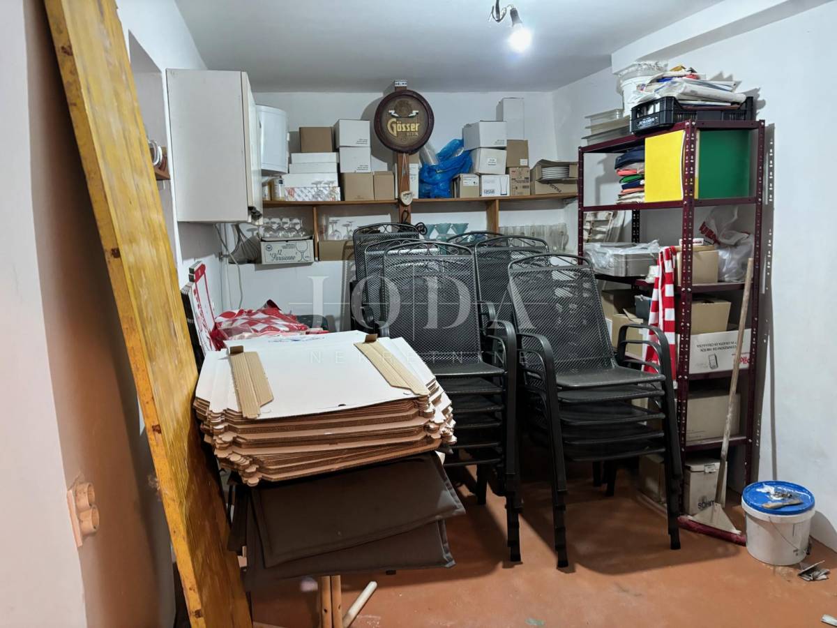 prostora za usluživanje gostiju, dva WC-a za goste, kuhinje, spremišta, unutarnjeg stubišta, balkona.