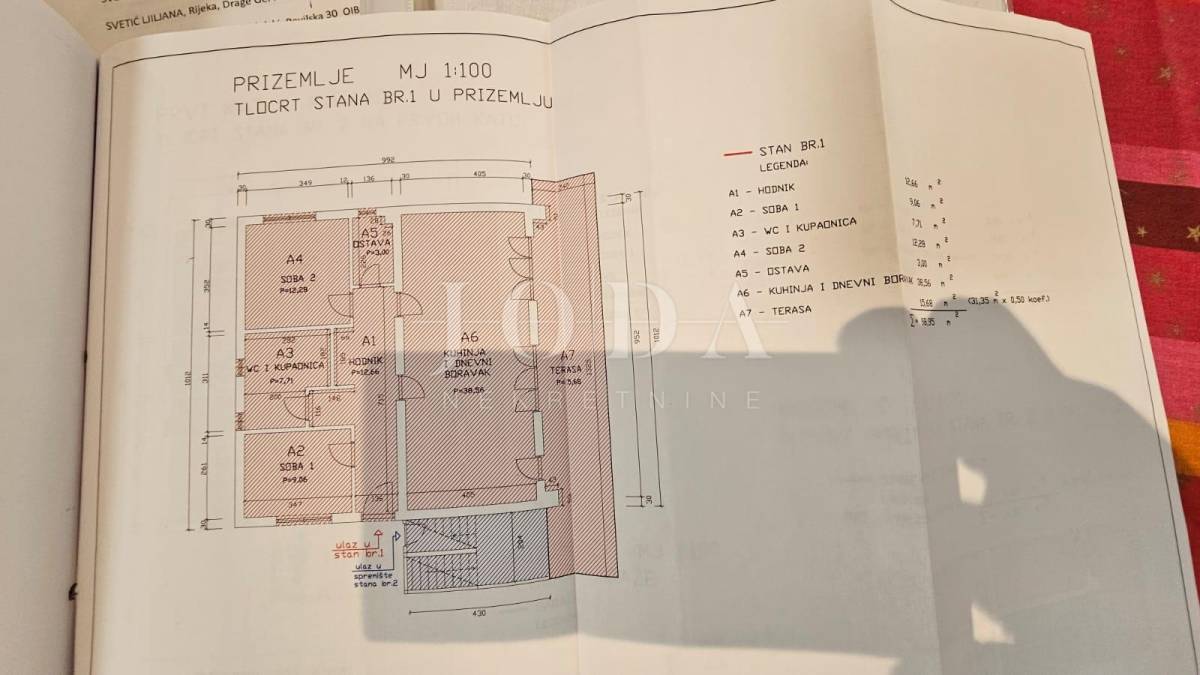 Prodaje se stan 98 m² s pogledom na more – sastoji se od 3 spavaće sobe, kupaonice i prostranog balkona(terase) s pogledom na more. Stan ima PVC stolariju, klimu u svim sobama, vlastiti priključak struje, kontrolna brojila vode, septičku jamu s pripremom za kanalizaciju. U mirnom okruženju, blizu svih sadržaja.