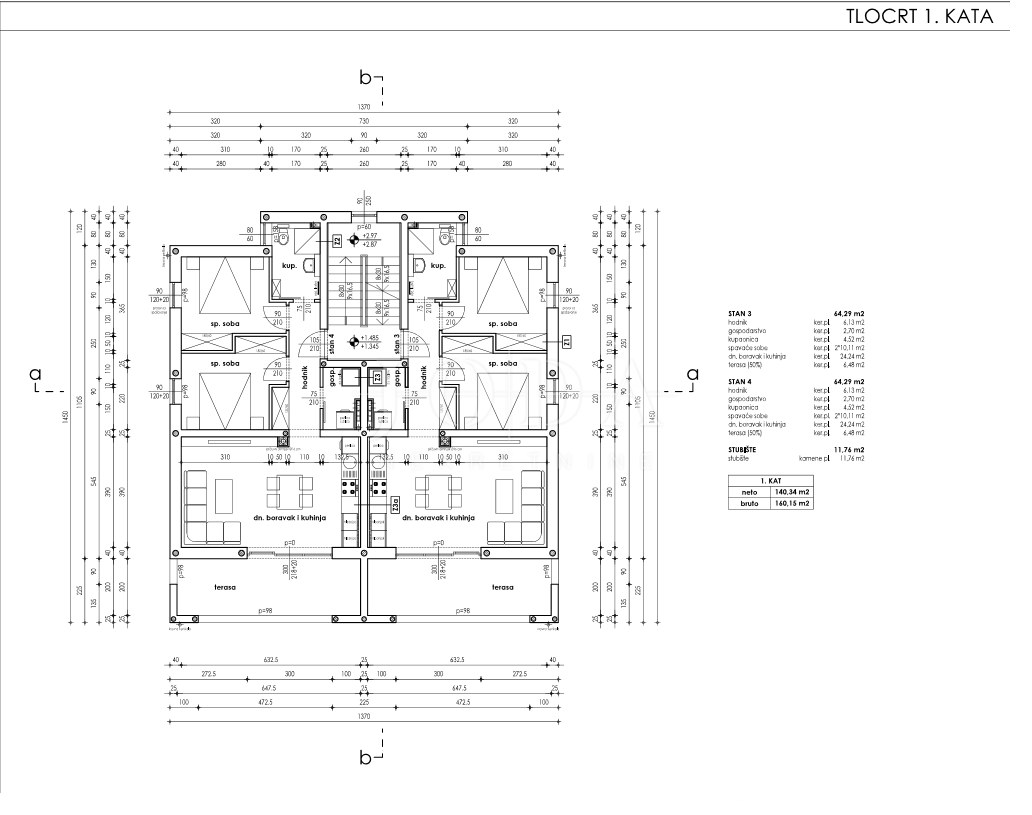 Stan je neto površine 64,29m2, dvije sobe, kupaonica, kuhinja, dnevni boravak i terasa veličine 13m2. Stanu pripada spremište veličine 9m2 i parkirno mjesto.
