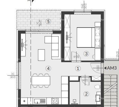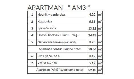 Stan AM3- nalazi se u prizemlju zgrade i sastoji od: hodika+garderoba, kupaonice, spavaće sobe, dnevnog boravka s kuhinjom i blagavaonom i vrta (neto 5.12m2)