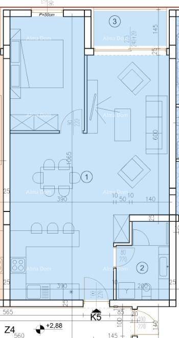Stan se nalazi na q. katu zgrade, orijentacije Sjever i osmišljen je za ugodan i funkcionalan boravak. Sastoji se od velikog ulaznog prostora, spavaće sobe, kupaonice, prostranog dnevnog boravka s kuhinjom i blagovaonicom te velike terase koja pruža dodatni prostor za opuštanje, ukupne površine 61.21m2.